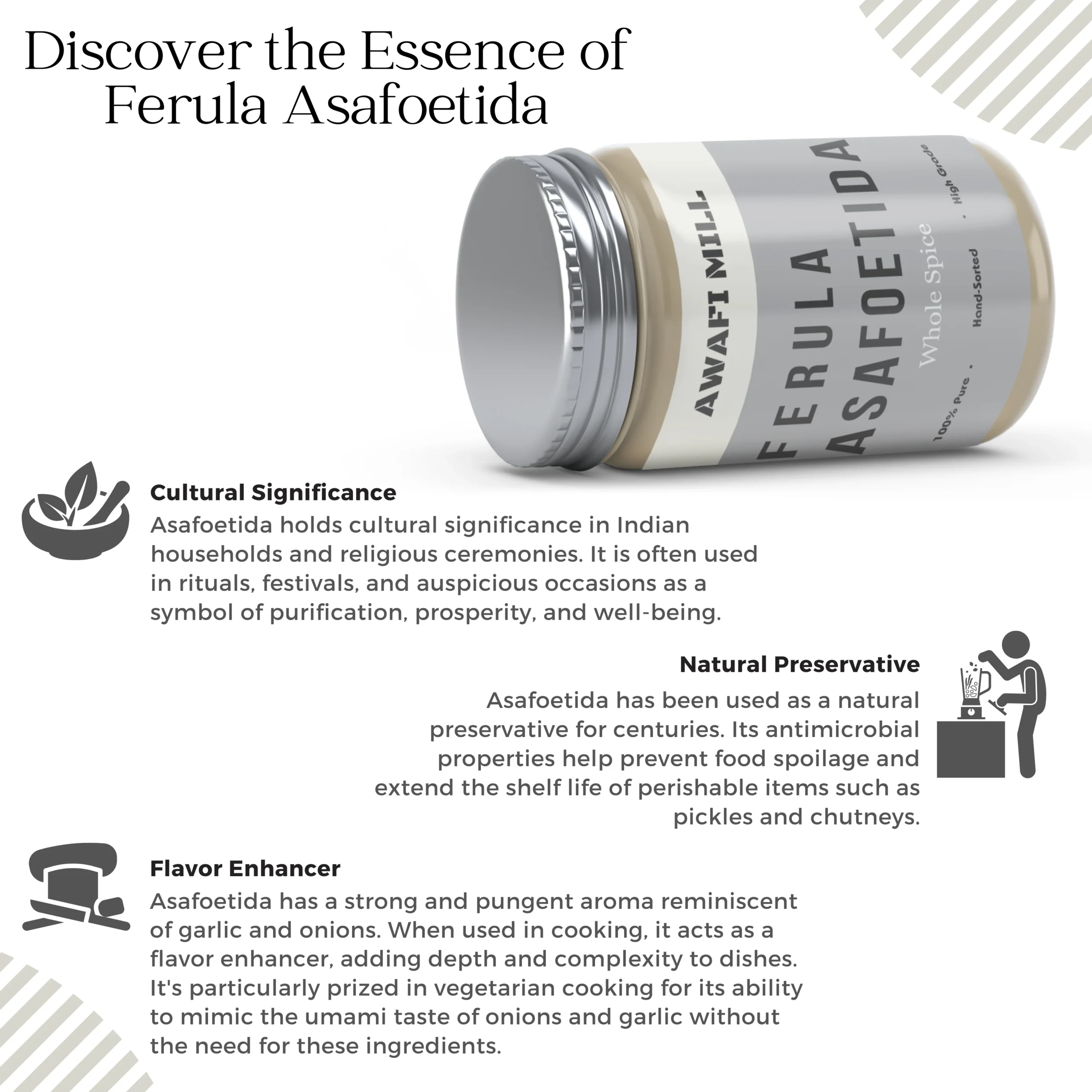 Awafi Mill Whole Asafoetida (Hing/Heeng) is a natural resin known for its intense aroma and flavor-enhancing properties. Sourced in solid form, this spice is ideal for slow tempering in oil or ghee, bringing depth to lentils, curries, and regional dishes.