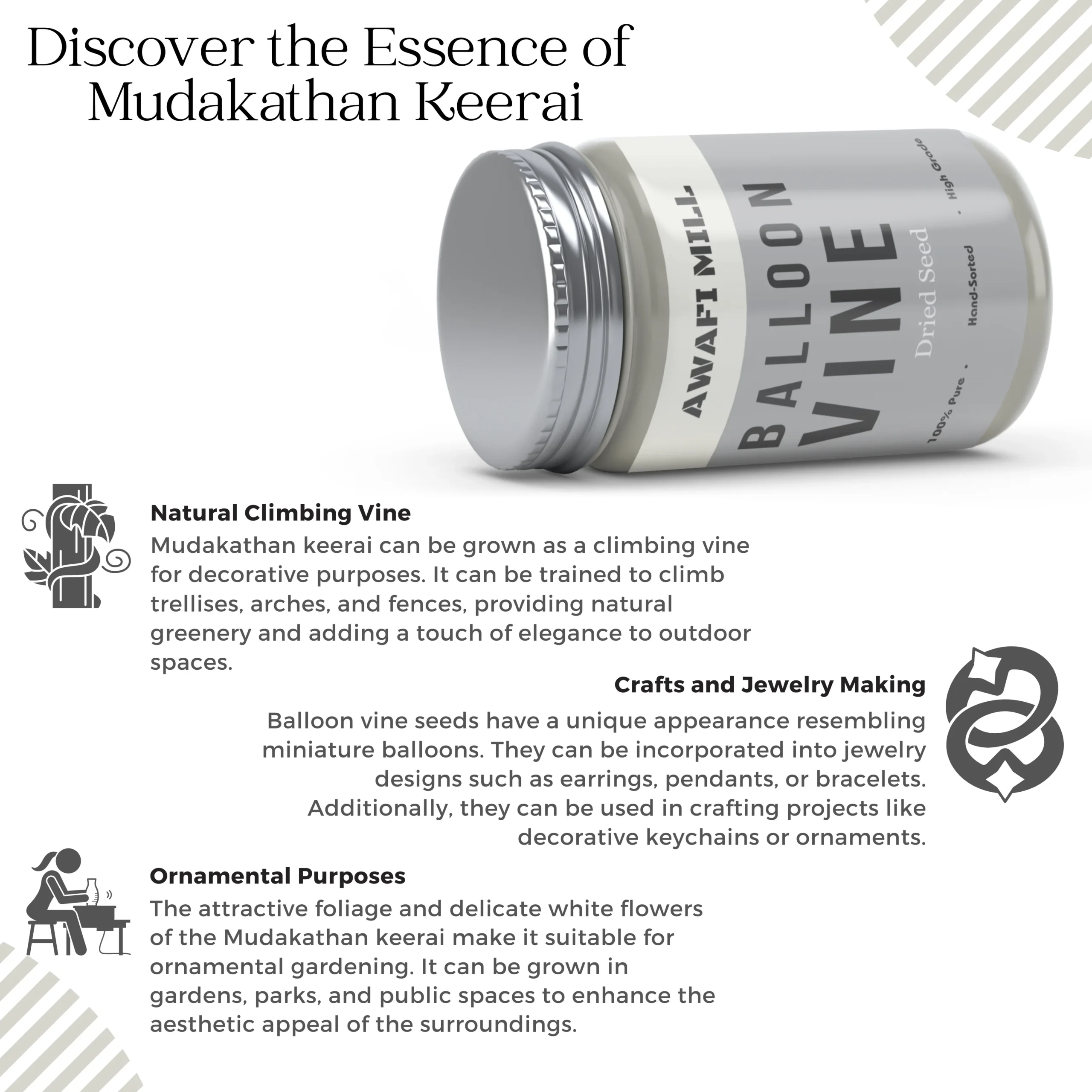 Balloon Vine Seeds, also known as Mudakathan and botanically called Cardiospermum Halicacabum, are naturally dried and sorted for purity. These seeds are traditionally valued in various regional preparations and are ideal for herbal blends or home uses.