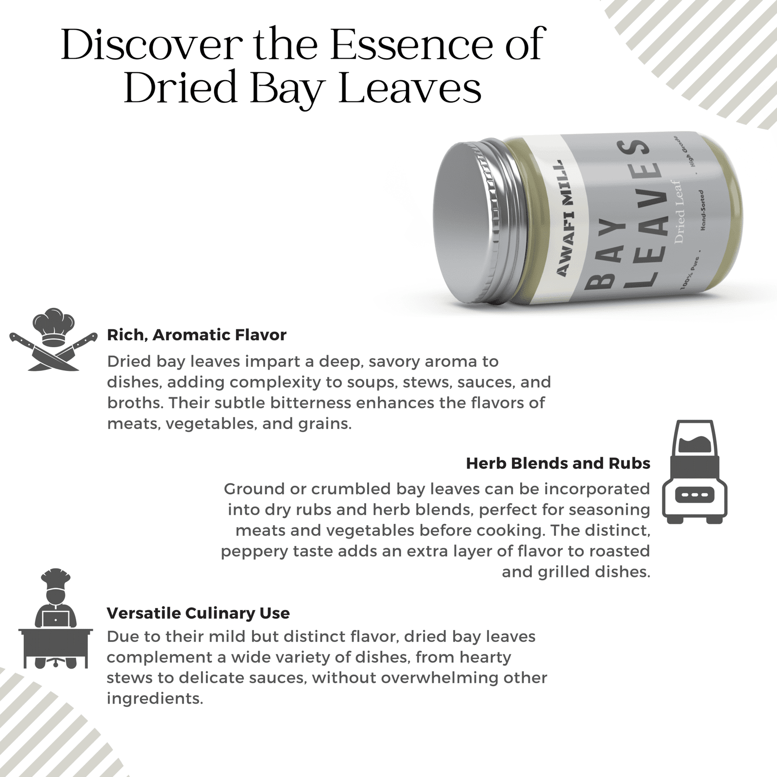 Awafi Mill Bay Leaves, also called Tej Patta, are carefully dried to preserve their full aroma and flavor. Commonly used in Indian and global cooking, these whole leaves are perfect for enhancing rice dishes, gravies, and slow-cooked recipes with their subtle, savory note.