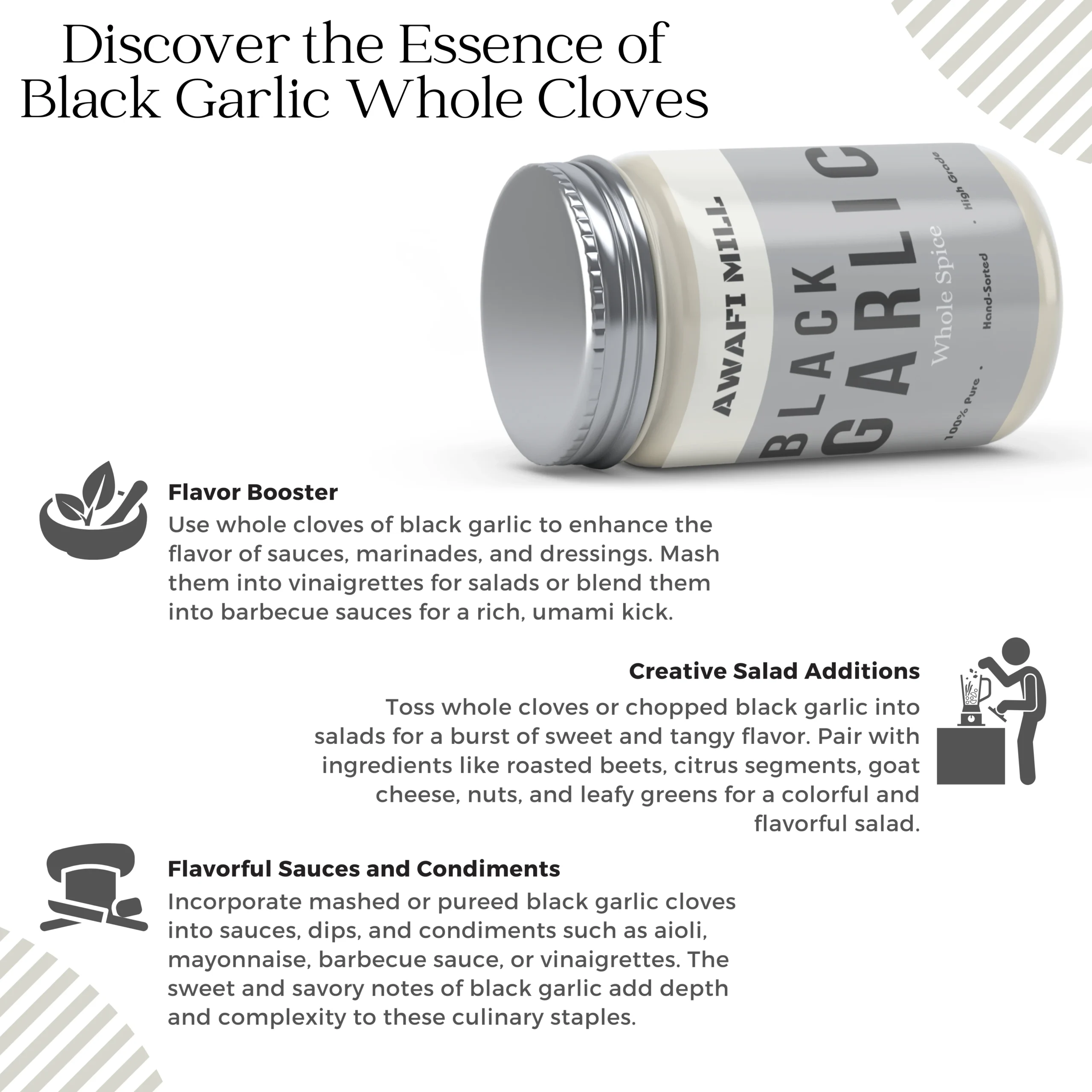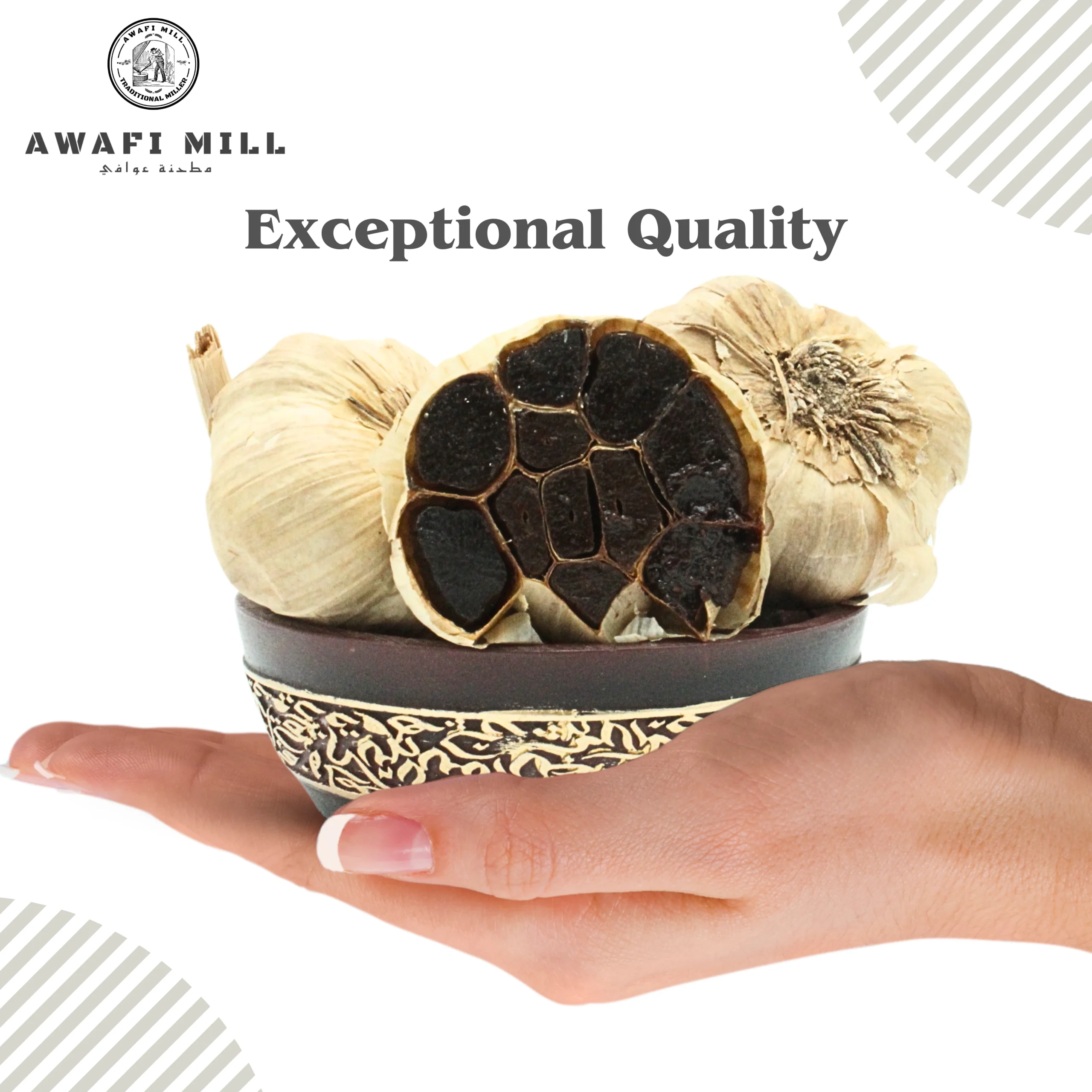 Awafi Mill Black Garlic features whole cloves that are slowly aged to develop a dark color and complex flavor. Known for their rich umami taste with sweet balsamic undertones, these cloves are a favorite in fine cooking and fusion recipes.