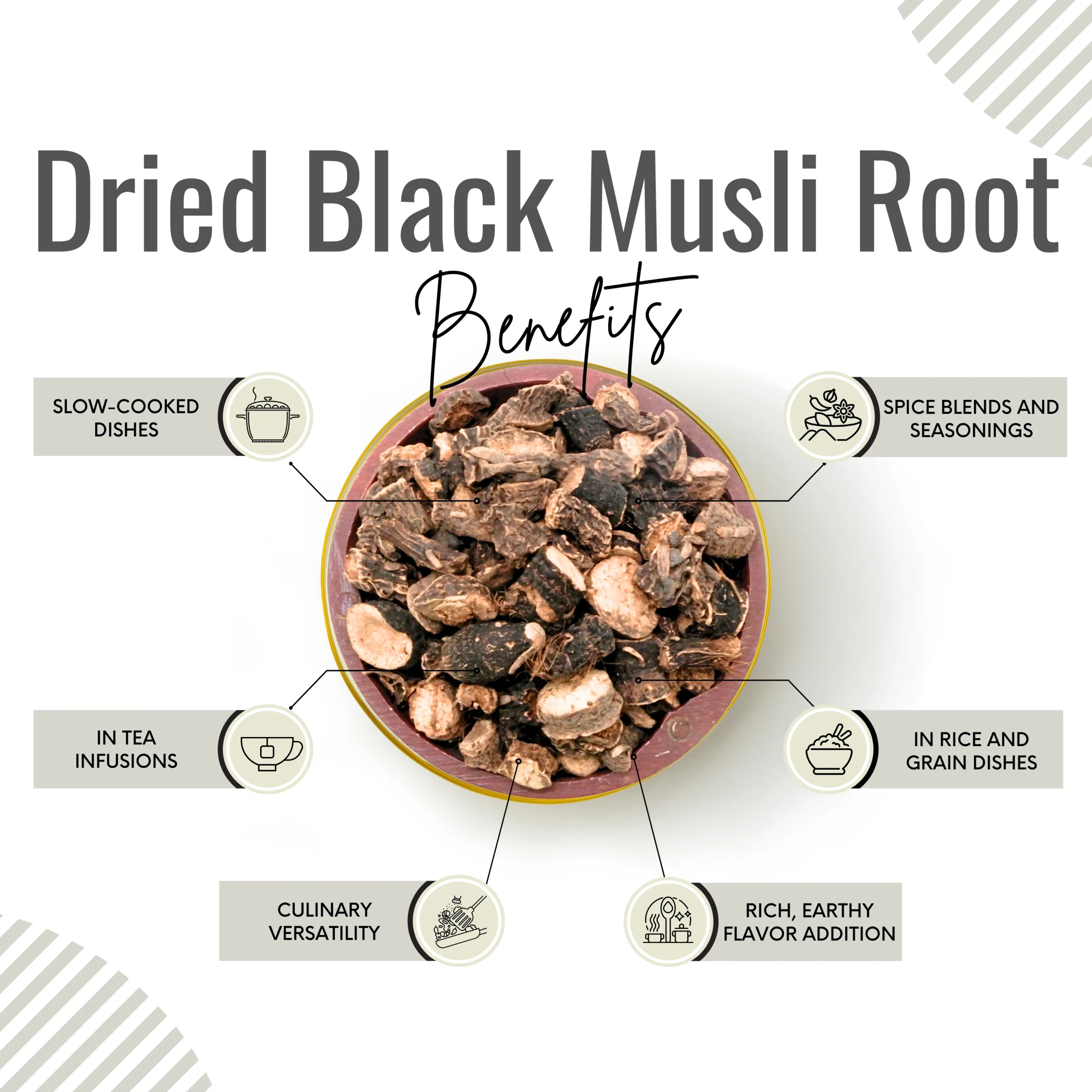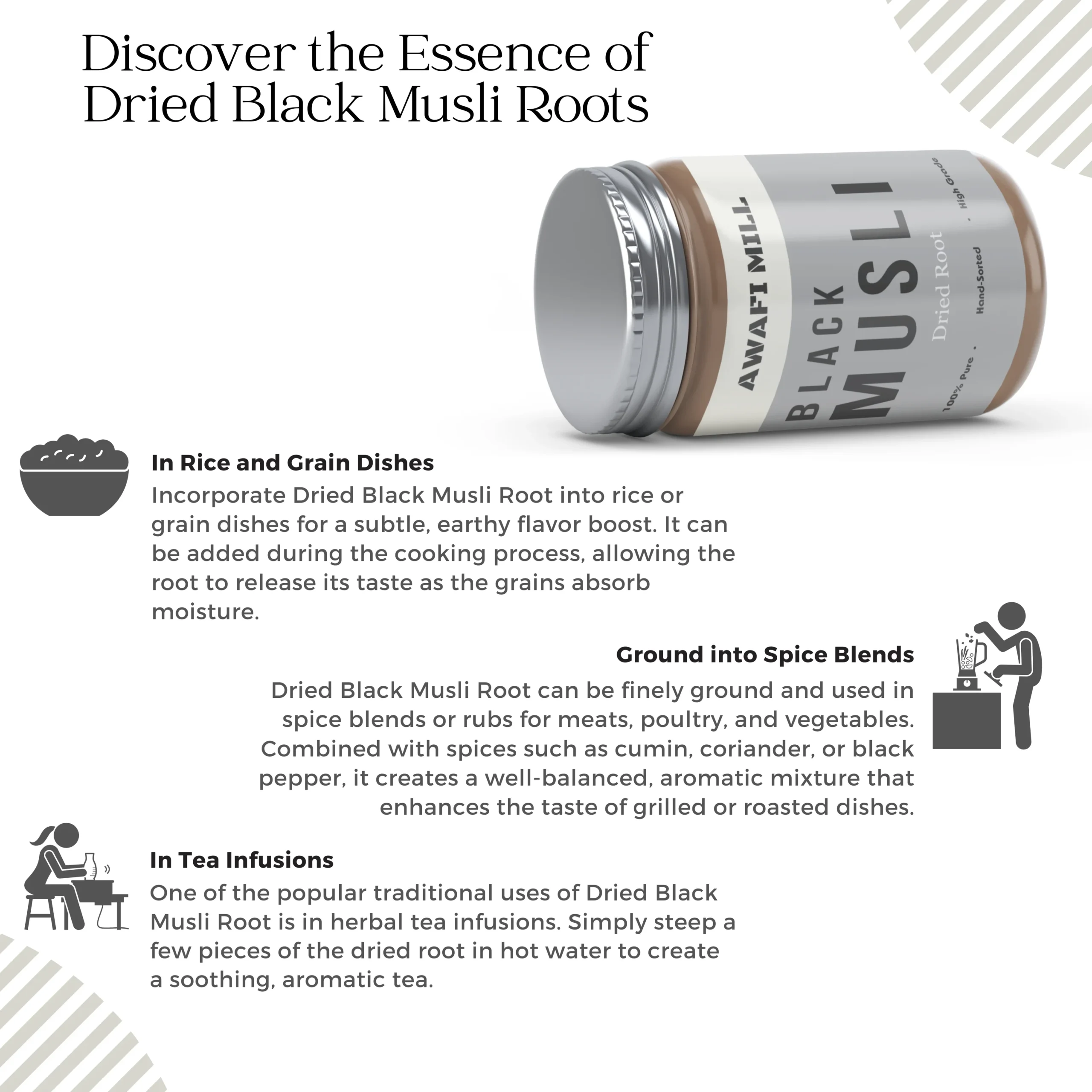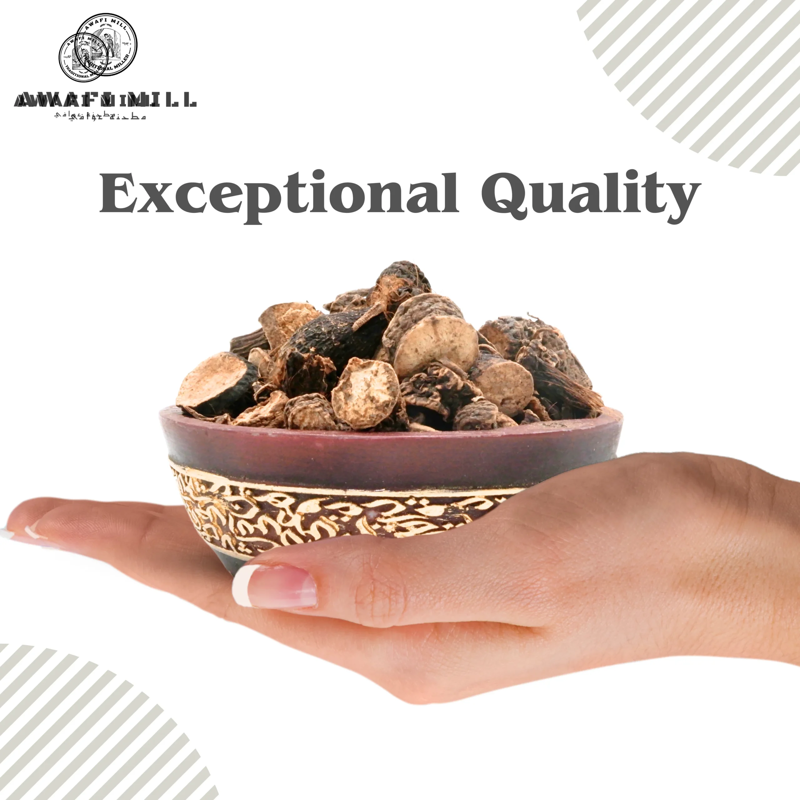 Awafi Mill Black Musli, also known as Kali Musli or Curculigo orchioides, is carefully harvested and naturally dried to preserve its firm texture and earthy aroma. Valued in traditional herbal practices, this root is commonly used in wellness blends and heritage herbal preparations.