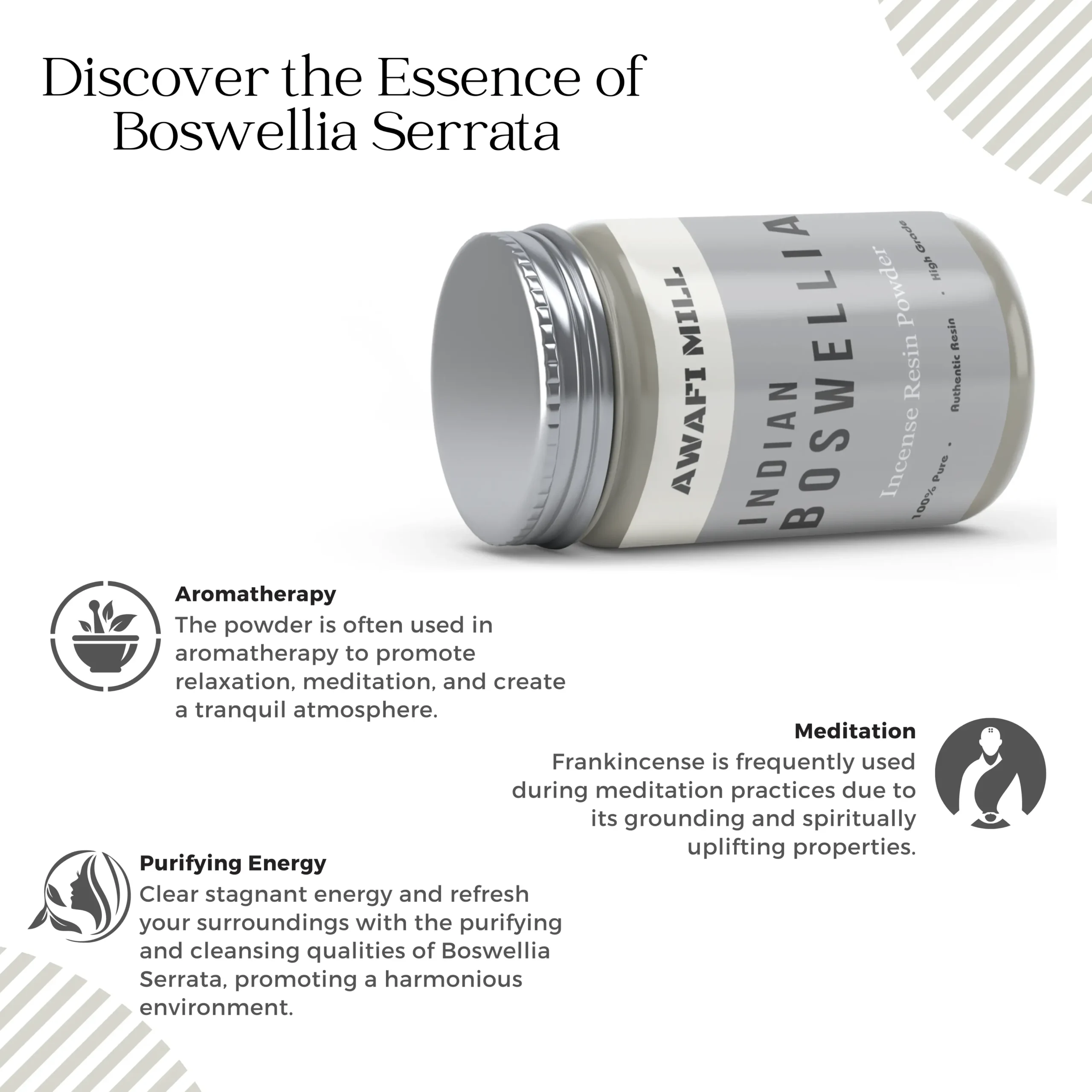 Awafi Mill Boswellia Serrata Powder, also known as Indian Frankincense, is made from high-quality resin ground to a fine texture. Known for its soothing fragrance and traditional significance, it’s widely used in incense blends, rituals, and heritage formulations.