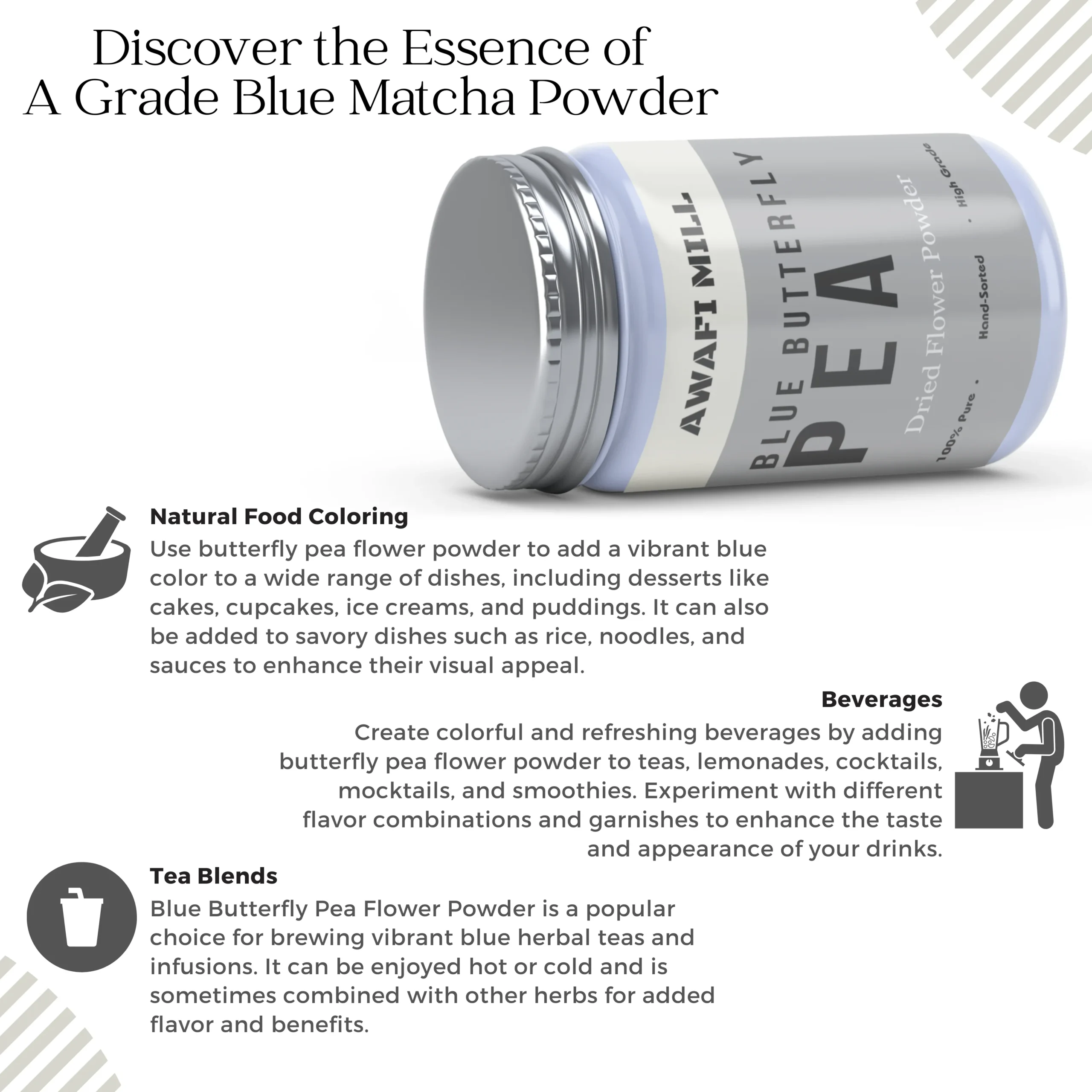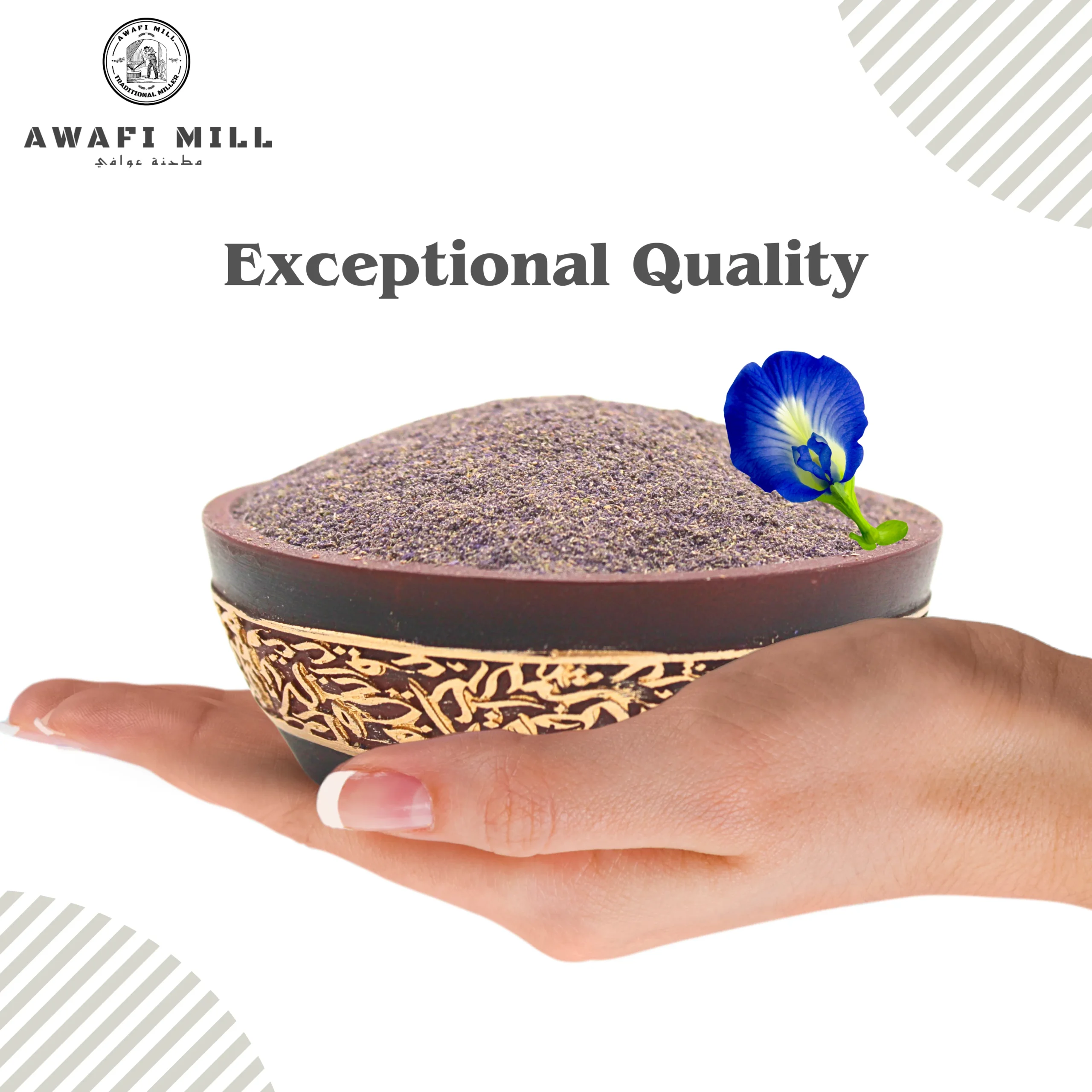 Awafi Mill Butterfly Pea Flower Powder is made from dried Clitoria ternatea blossoms, finely ground to preserve their vibrant blue hue and natural properties. Ideal for use in colorful tea blends, smoothies, desserts, and DIY skincare recipes, this botanical powder offers beauty and function in one.