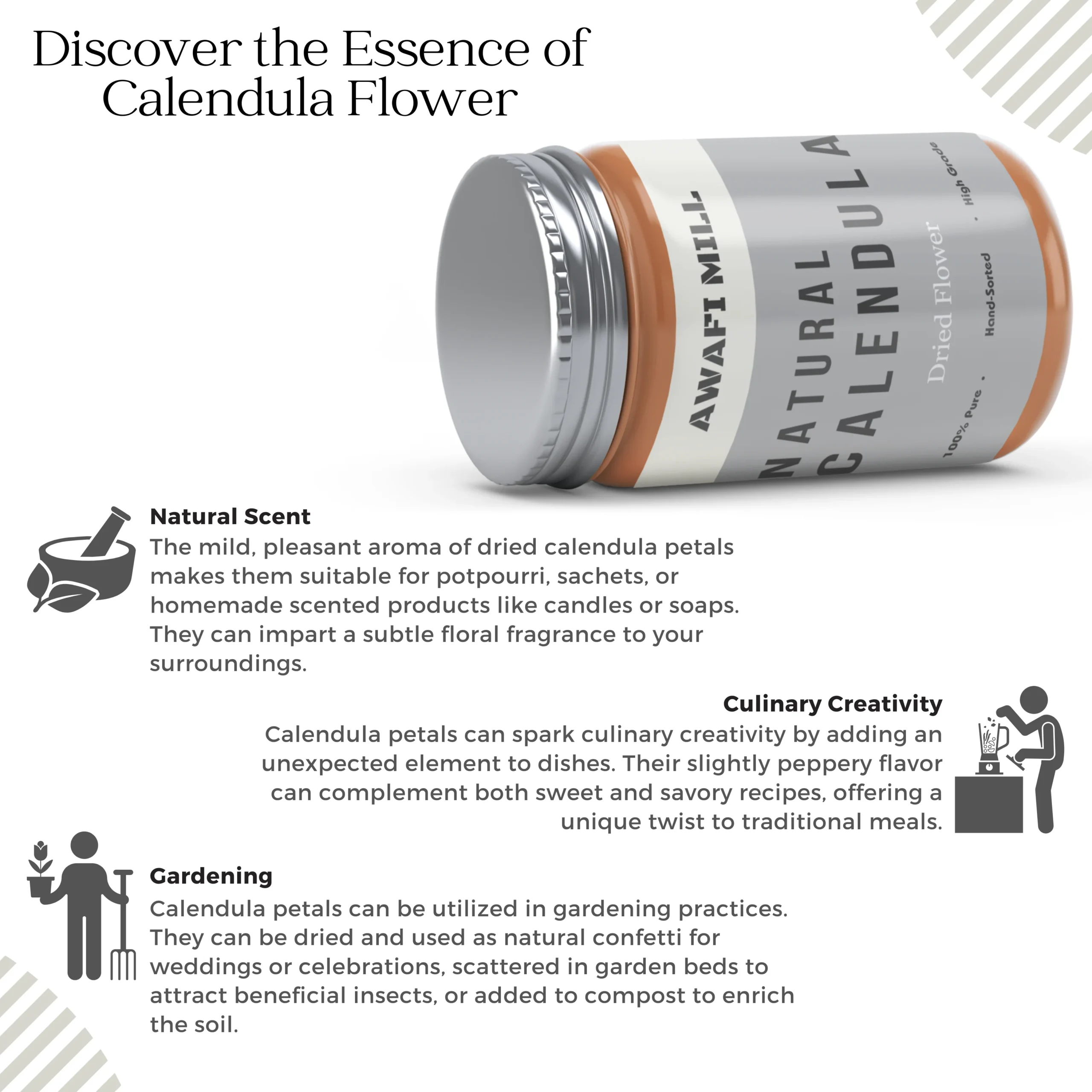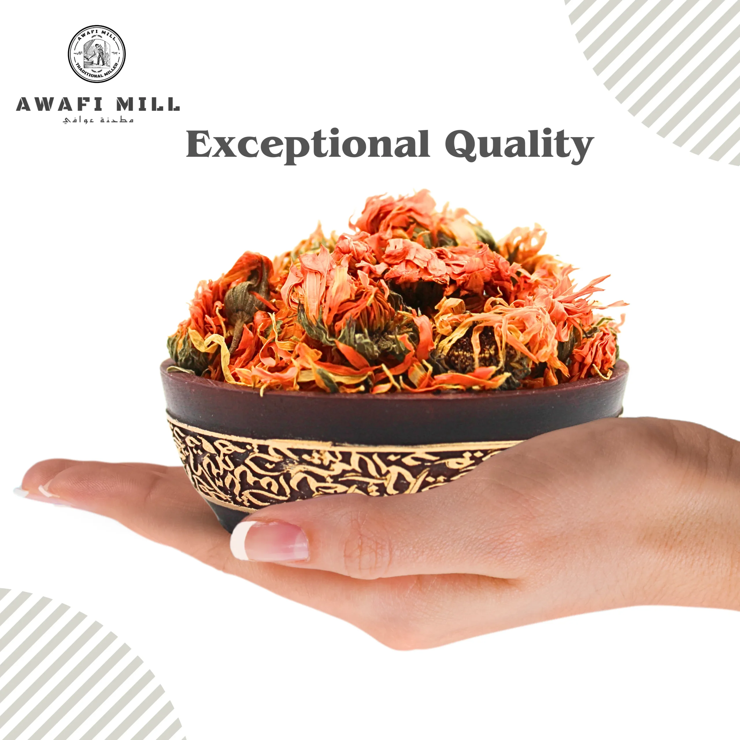 Awafi Mill Calendula Flower is naturally dried from marigold blossoms, preserving their golden color and gentle fragrance. Traditionally used in herbal infusions, skin-soothing bath blends, and decorative potpourri, these petals bring a warm, calming touch to natural remedies and creative uses.