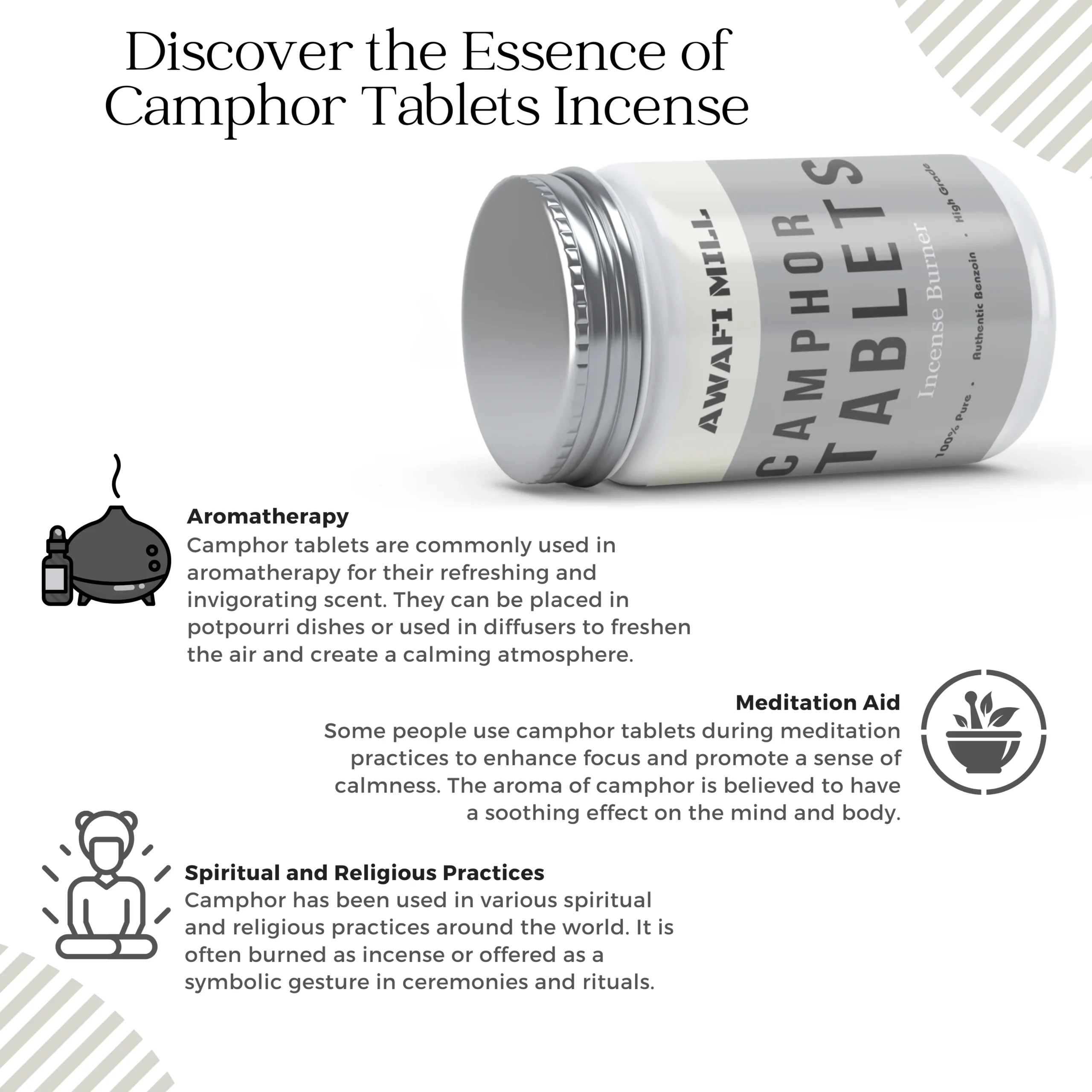 Awafi Mill Camphor Tablets are crafted from pure camphor crystals, offering a crisp, refreshing fragrance. Commonly used in spiritual rituals, they purify spaces and create a serene, uplifting atmosphere.