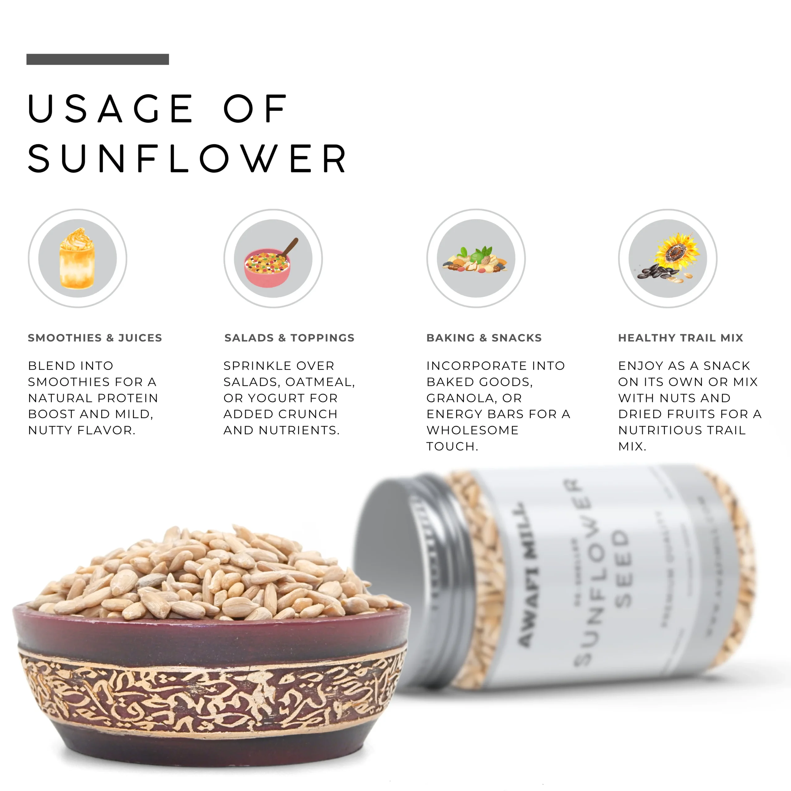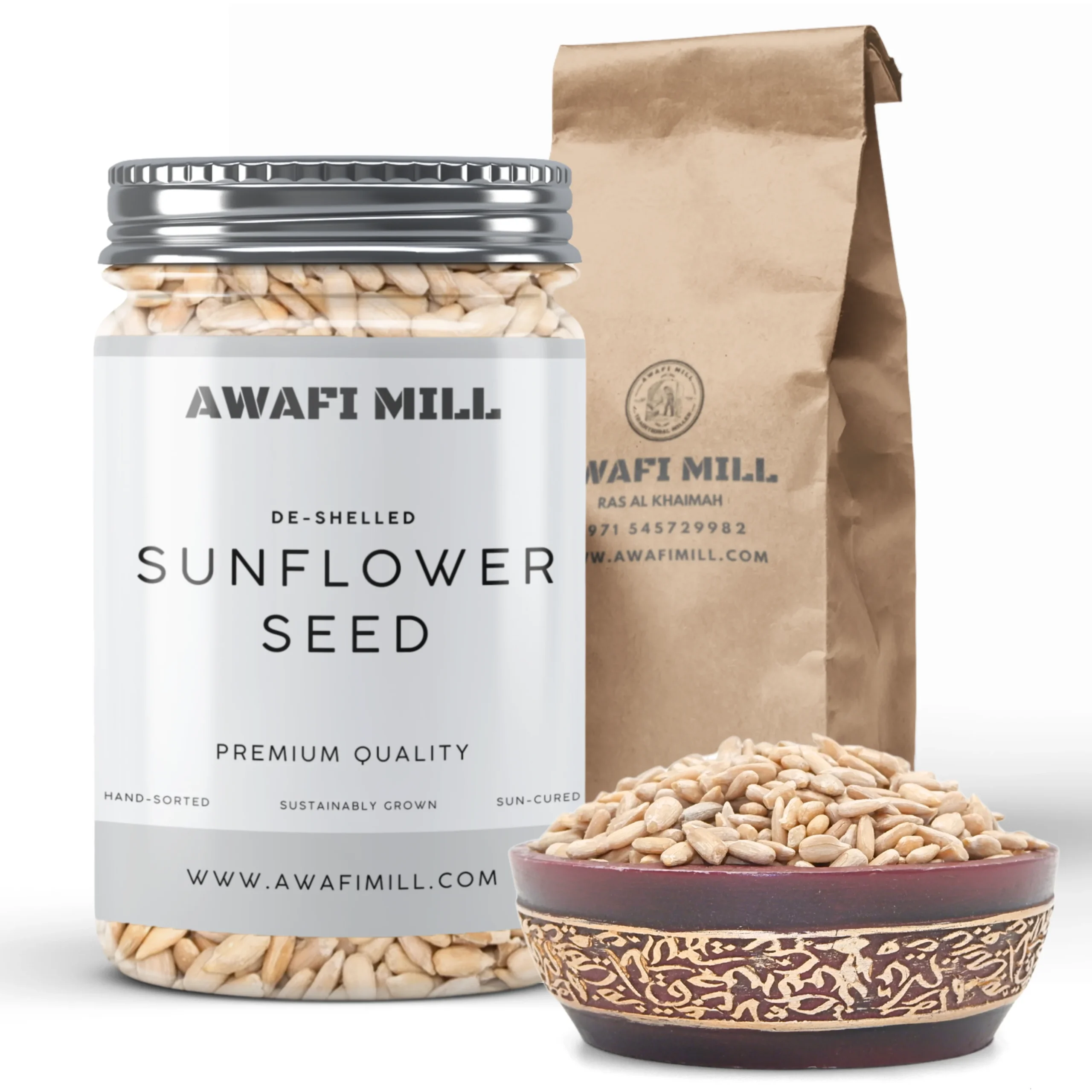 Awafi Mill De-Shelled Sunflower Seeds (Hulled Sunflower Kernels) are nutritious, ready-to-use seeds ideal for both sweet and savory dishes. Perfect for snacking, baking, or adding texture to health-conscious meals.