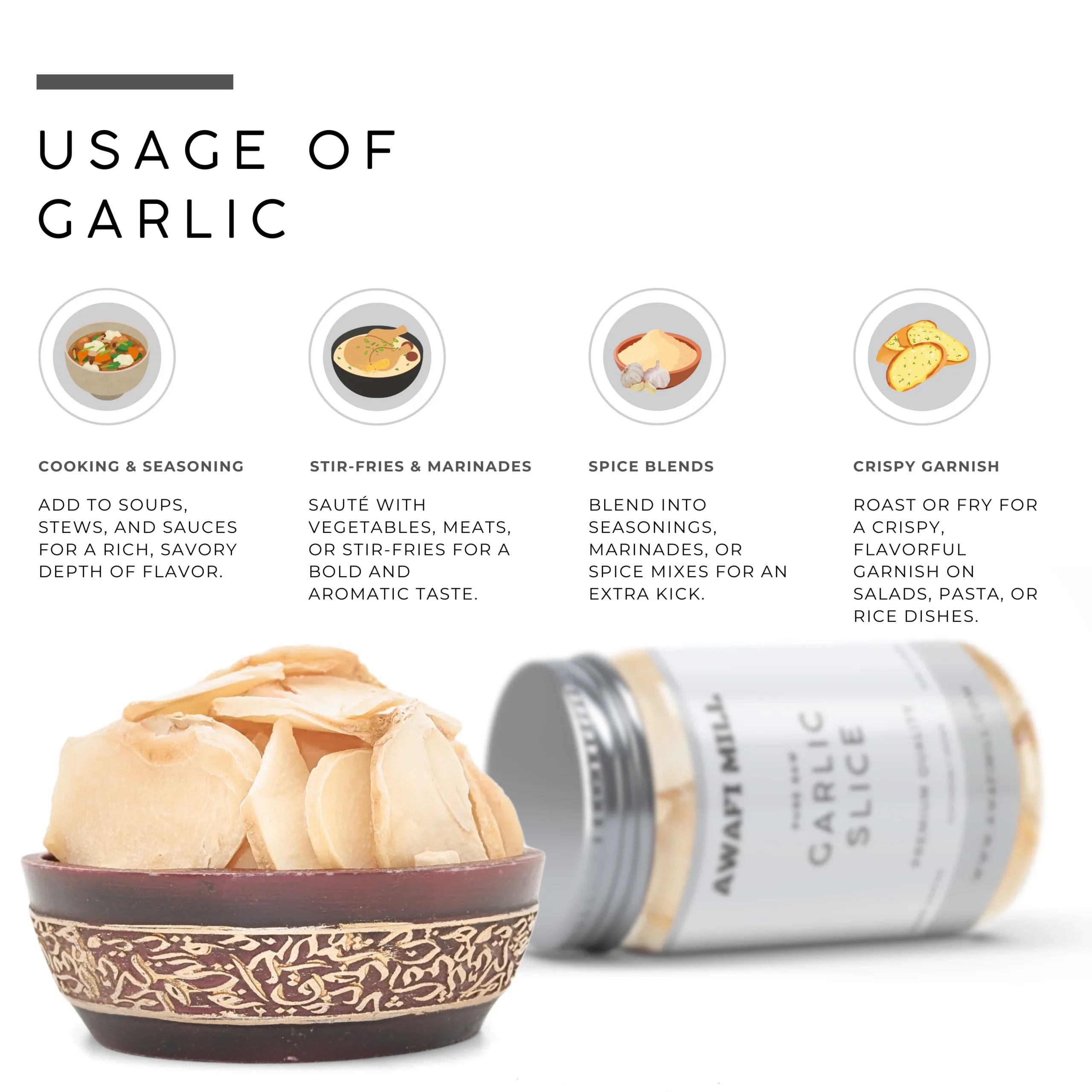 Awafi Mill Dried Garlic Slices are made from premium garlic cloves, air-dried to preserve their rich flavor and aroma. Ideal for soups, stews, spice blends, and marinades, these flakes offer all the boldness of garlic in a shelf-stable, easy-to-use form.