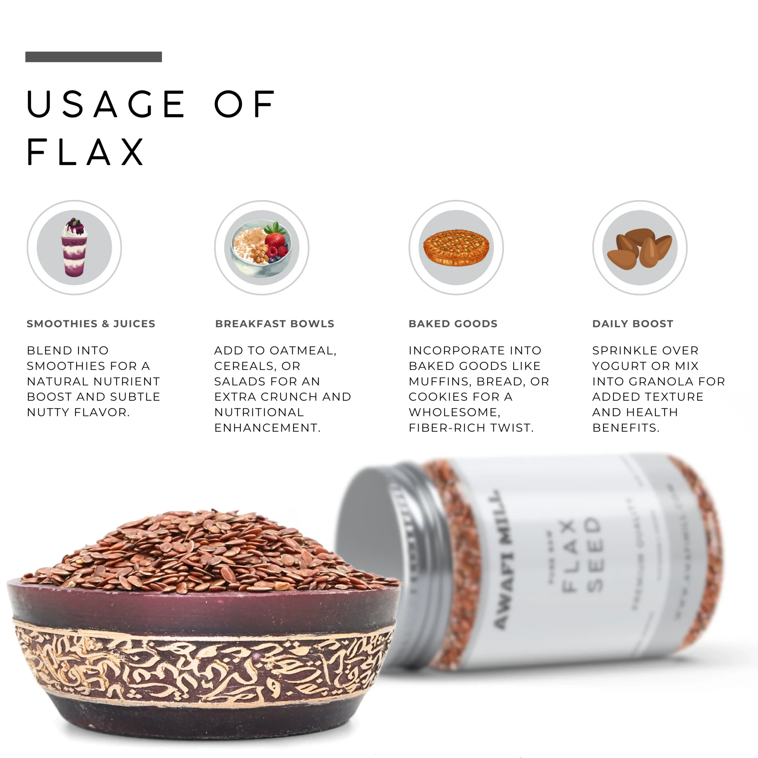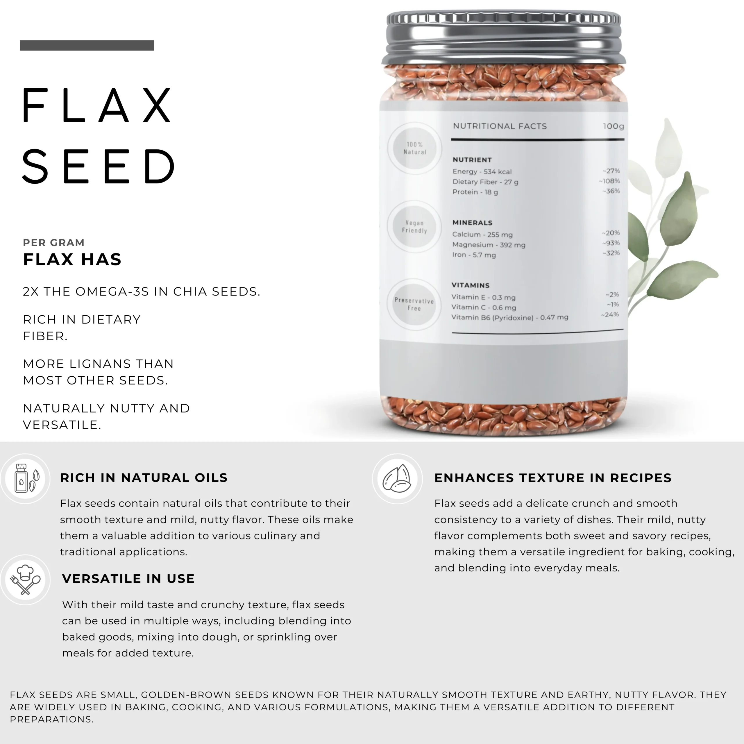 Flax Seeds, also known as Linseed, are versatile edible seeds commonly used in a variety of culinary applications. Perfect for blending into smoothies, baking, or topping on salads and cereals, these natural seeds are appreciated for their mild, nutty flavor. A pantry essential for wholesome cooking.