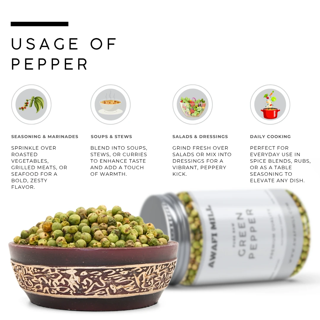 Awafi Mill Green Peppercorns are premium-quality whole green pepper, carefully dried to retain their natural flavor and color. With a milder taste than black pepper, they?re a perfect addition to brines, creamy sauces, and specialty cuisine.