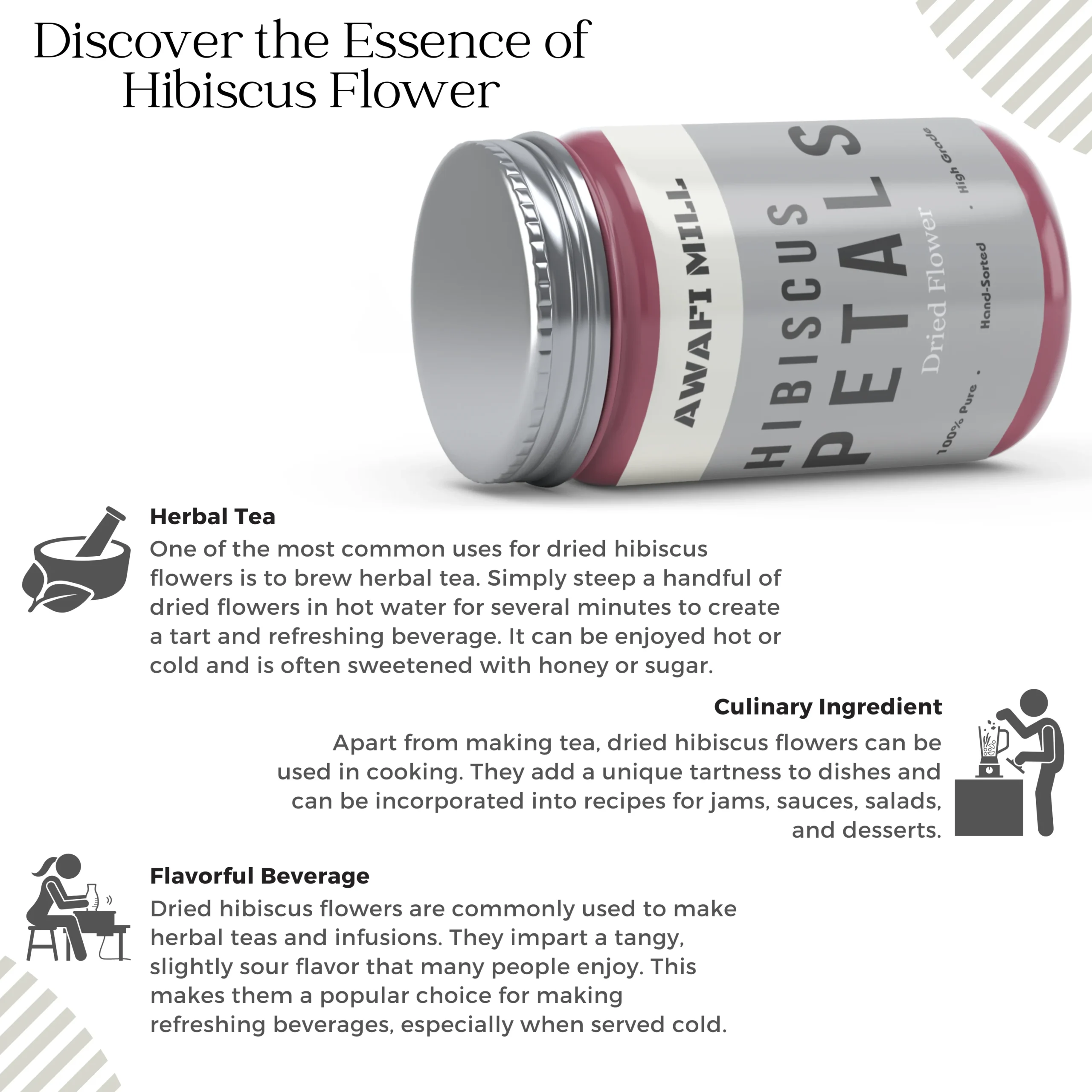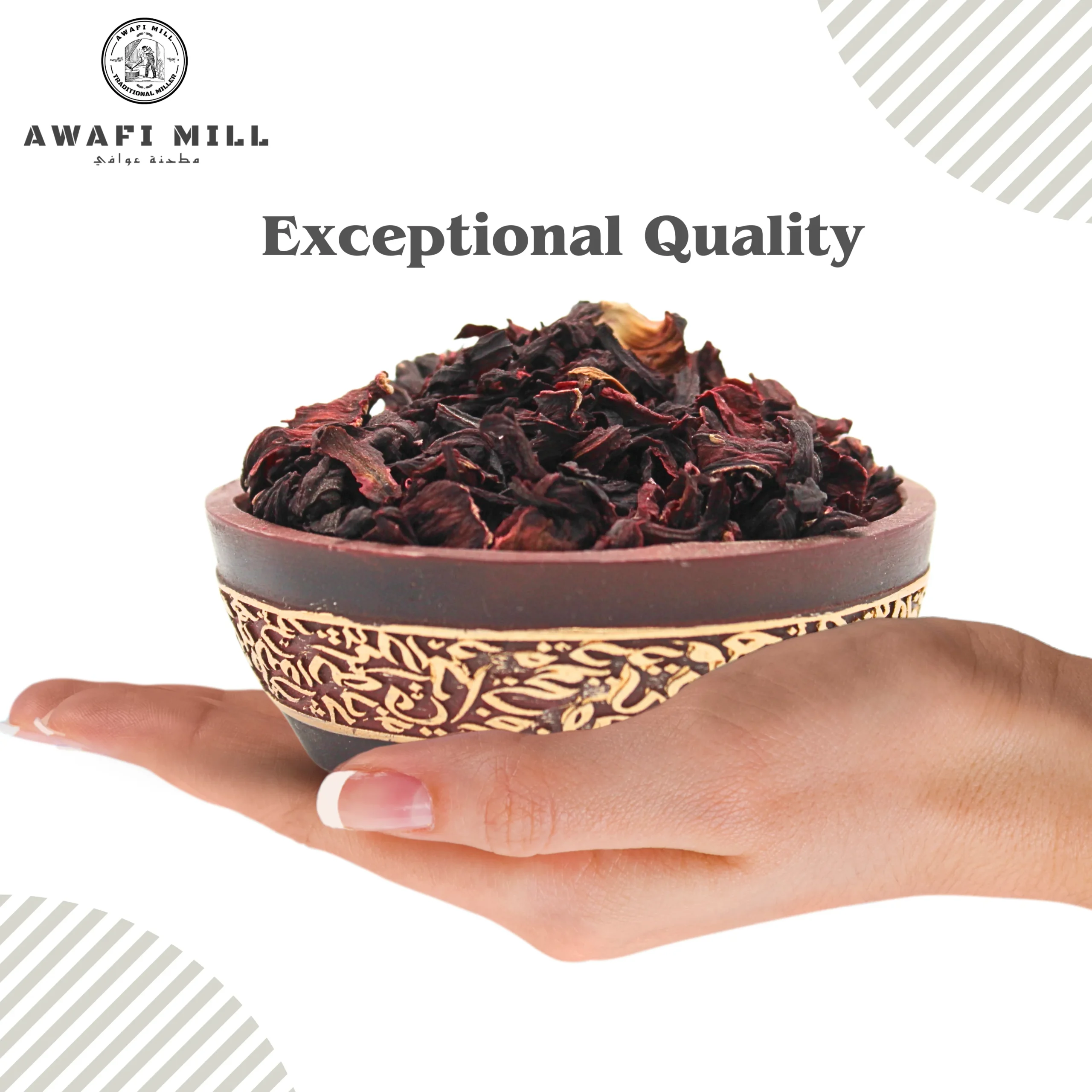 Awafi Mill Hibiscus Flower Petals are carefully dried from Hibiscus rosa-sinensis, known for their vibrant red color and tart floral scent. Commonly used in tea infusions, traditional beauty treatments, and wellness rituals, these petals add bold flavor, natural color, and soothing benefits to a variety of uses.