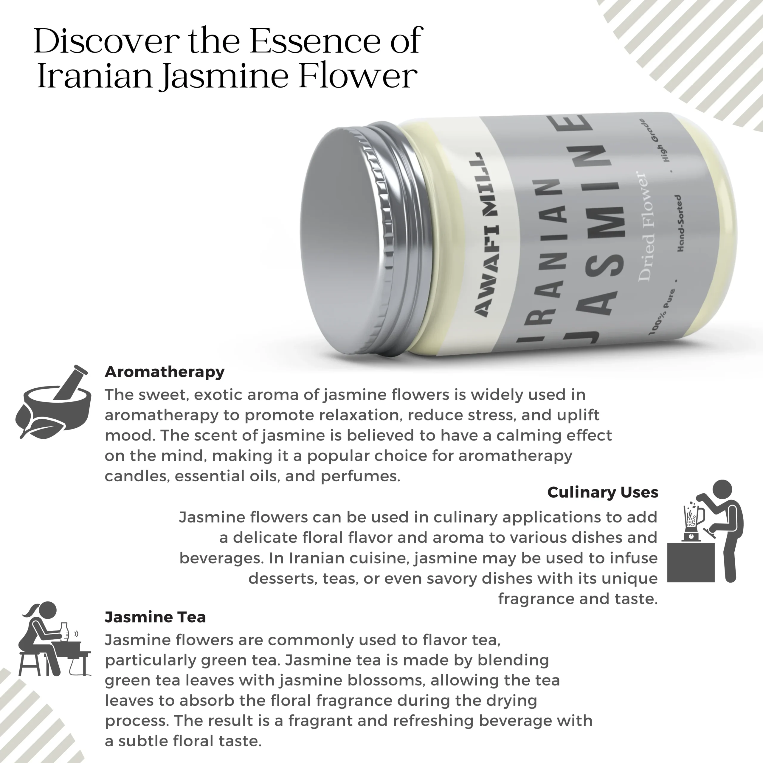 Awafi Mill Iranian Jasmine Flower, also known as Persian Jasmine, is delicately dried to preserve its natural fragrance and floral elegance. Prized for its soft, sweet scent, this jasmine is ideal for herbal teas, decorative blends, and calming aromatic experiences. A classic flower of beauty and tradition.