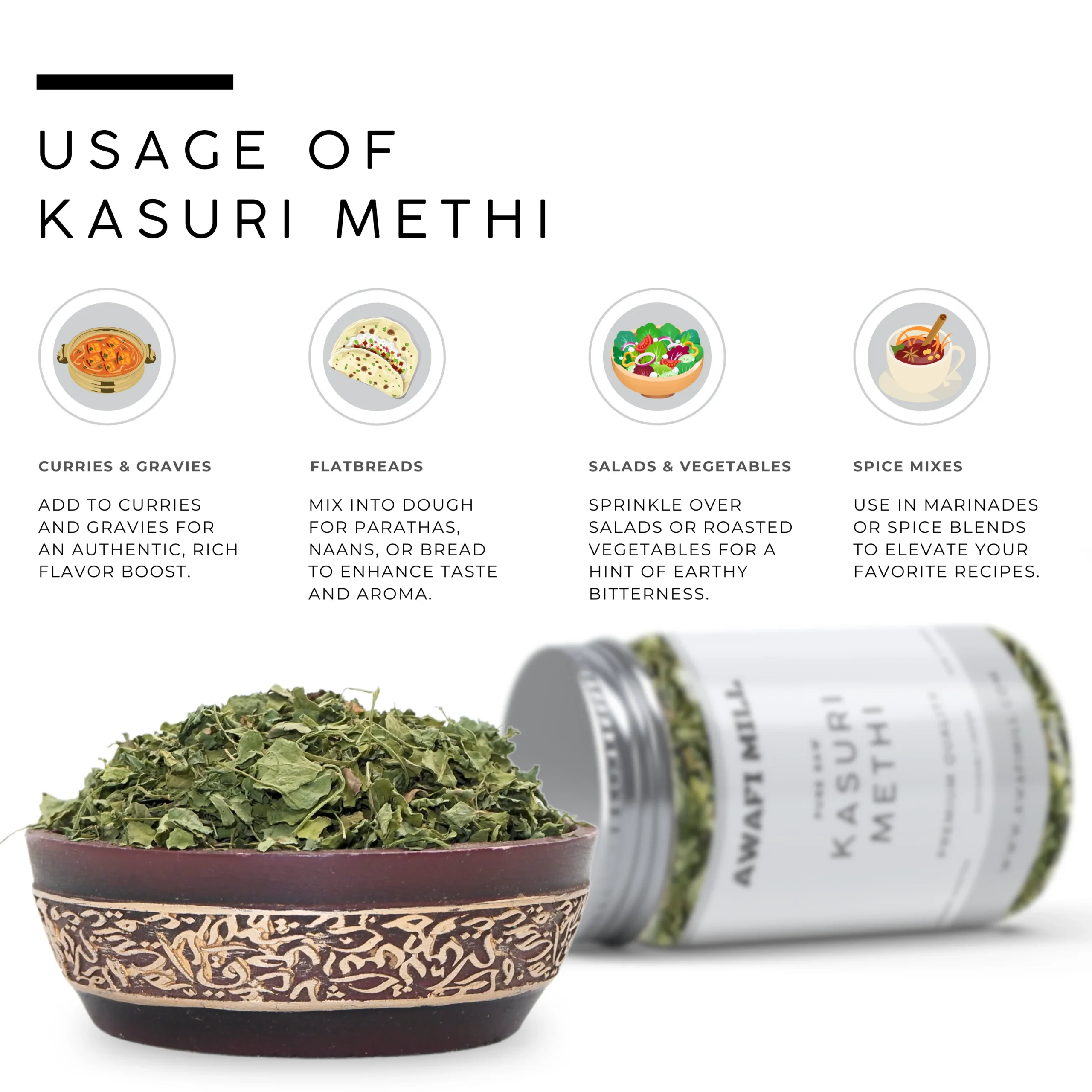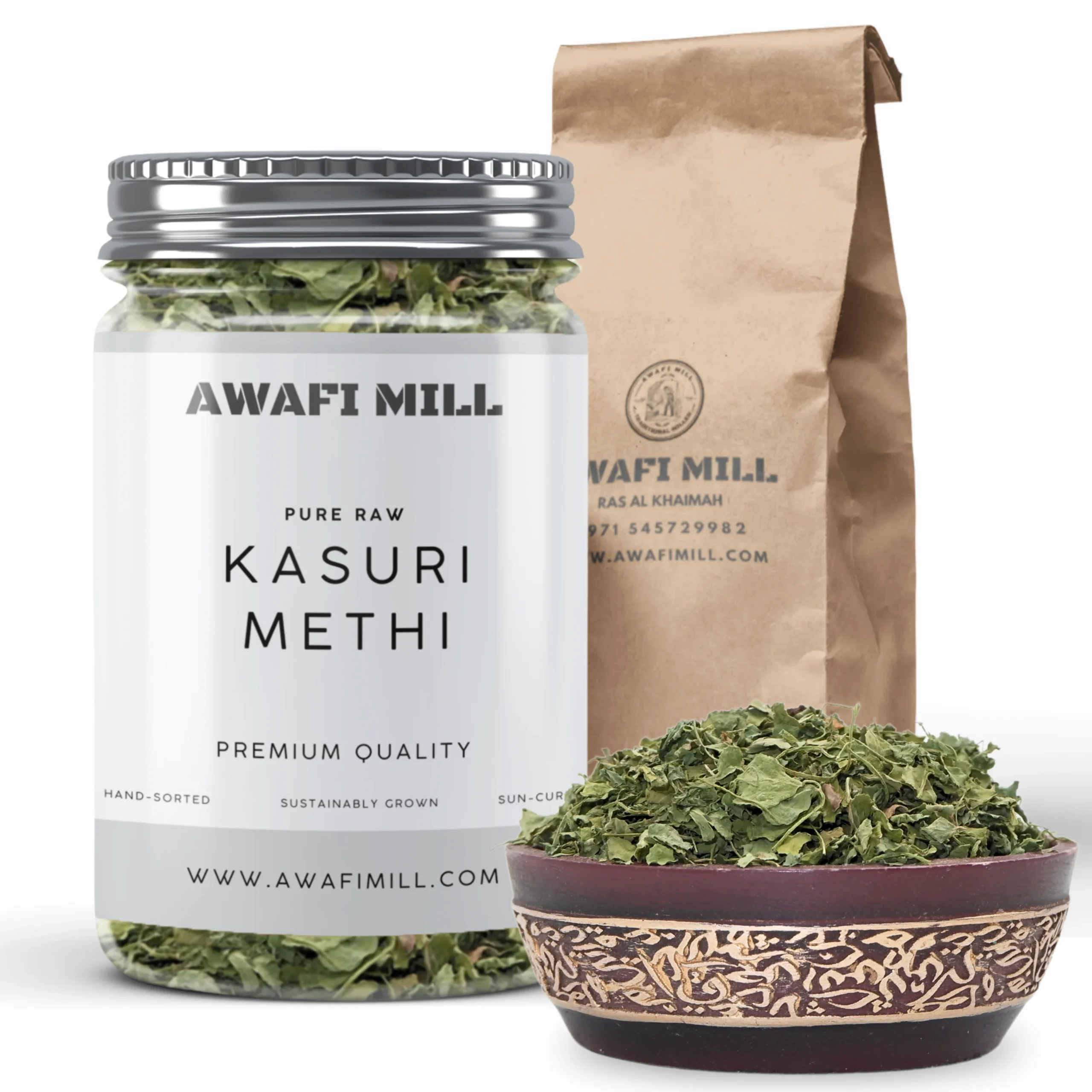 Awafi Mill Kasuri Methi is made from carefully dried fenugreek leaves, traditionally known as Qasuri Methi. These crushed leaves add a bold, earthy aroma and distinctive taste to dals, sabzis, parathas, and spice blends in North Indian cooking.