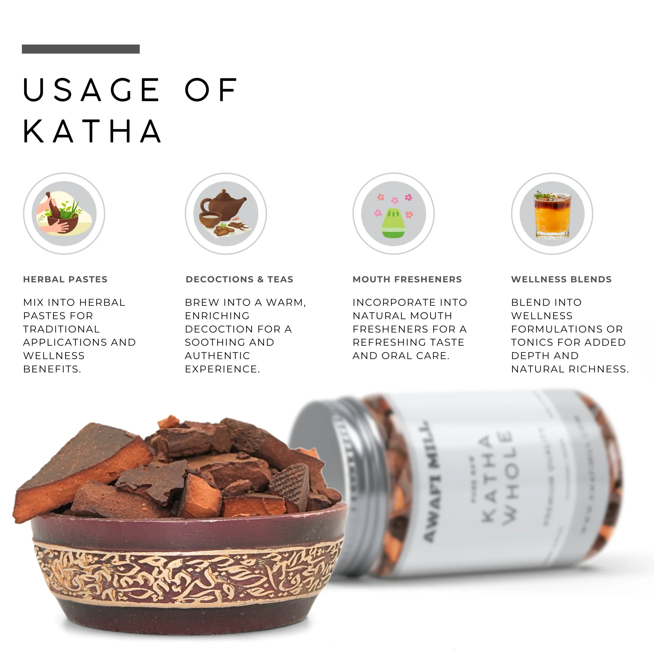 Awafi Mill Katha is made from the heartwood extract of the Acacia Catechu tree, processed into dense, reddish blocks. Traditionally added to paan or used in natural preparations for its distinct flavor and properties.