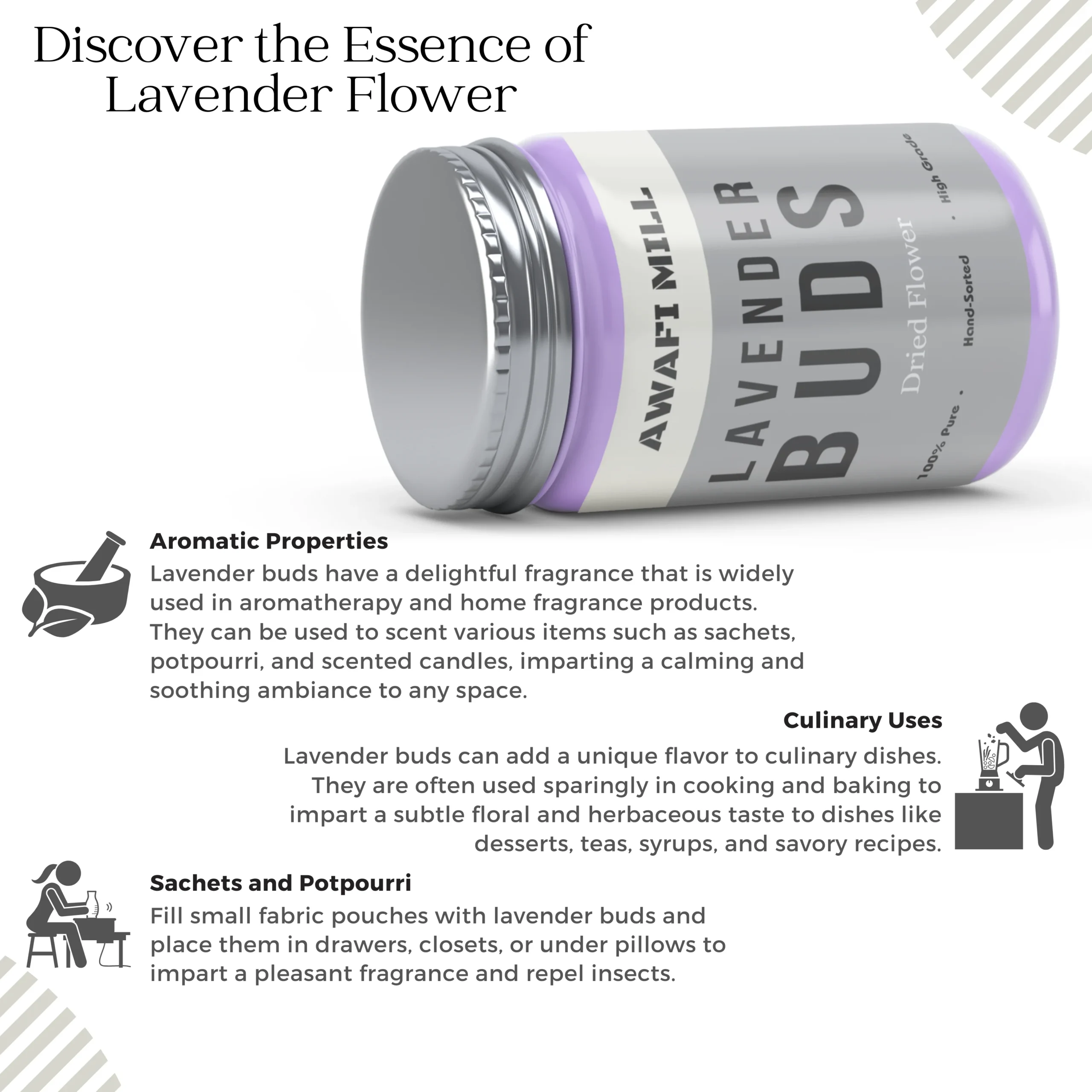 Awafi Mill Lavender Flower Buds are delicately dried to preserve their soft purple hue and relaxing fragrance. Known for their calming properties, these buds are perfect for herbal teas, sleep blends, bath soaks, and aromatic sachets. A versatile botanical for both wellness and scent.