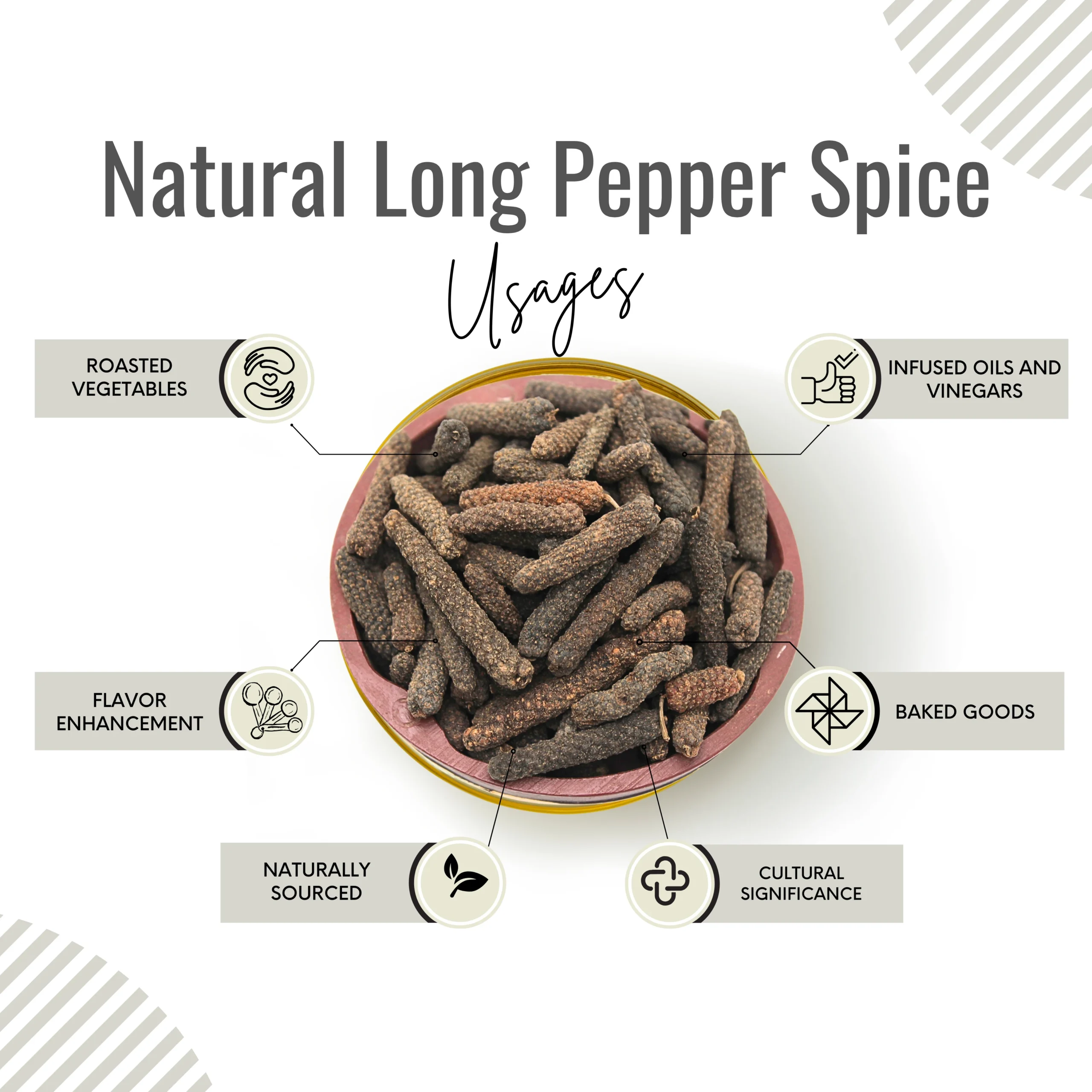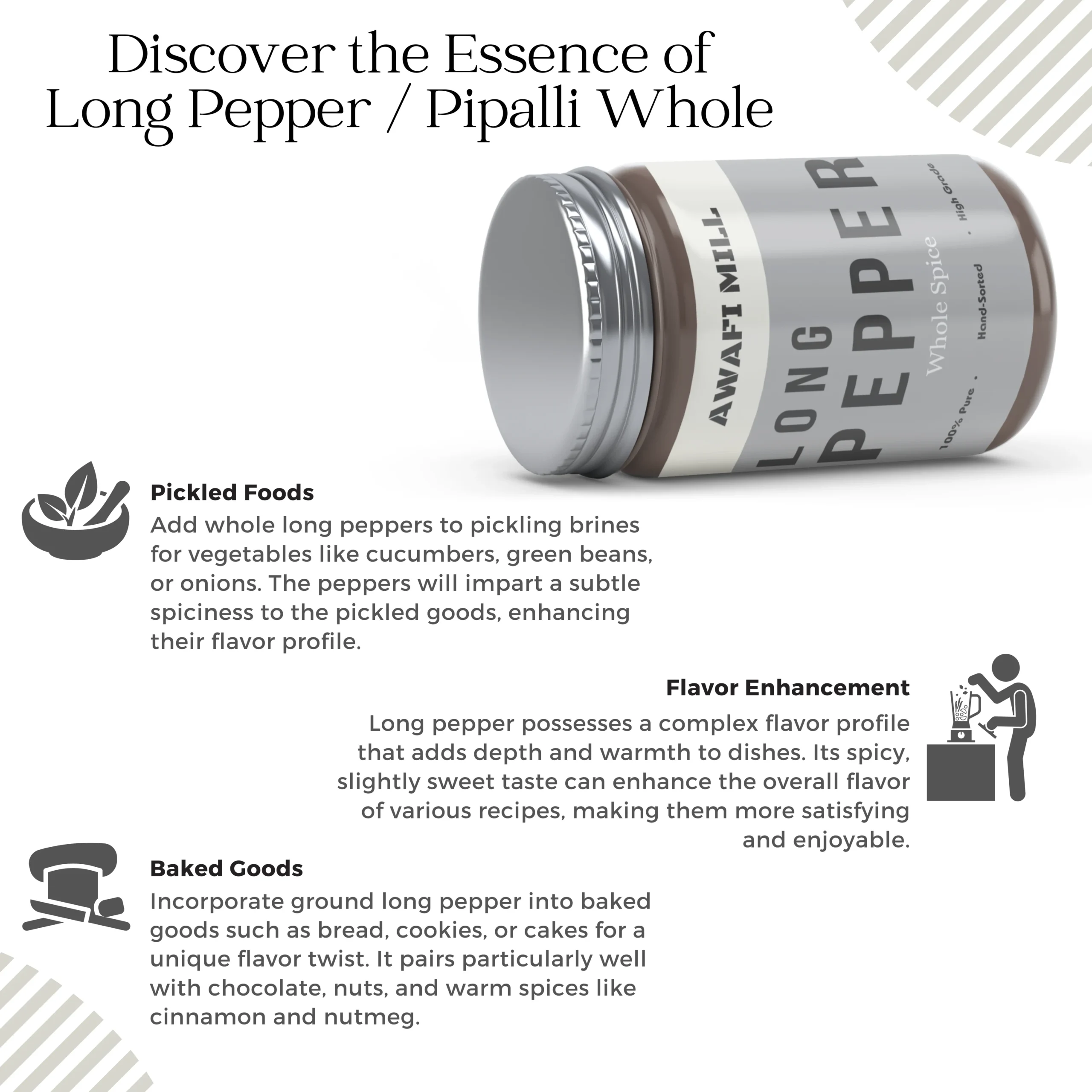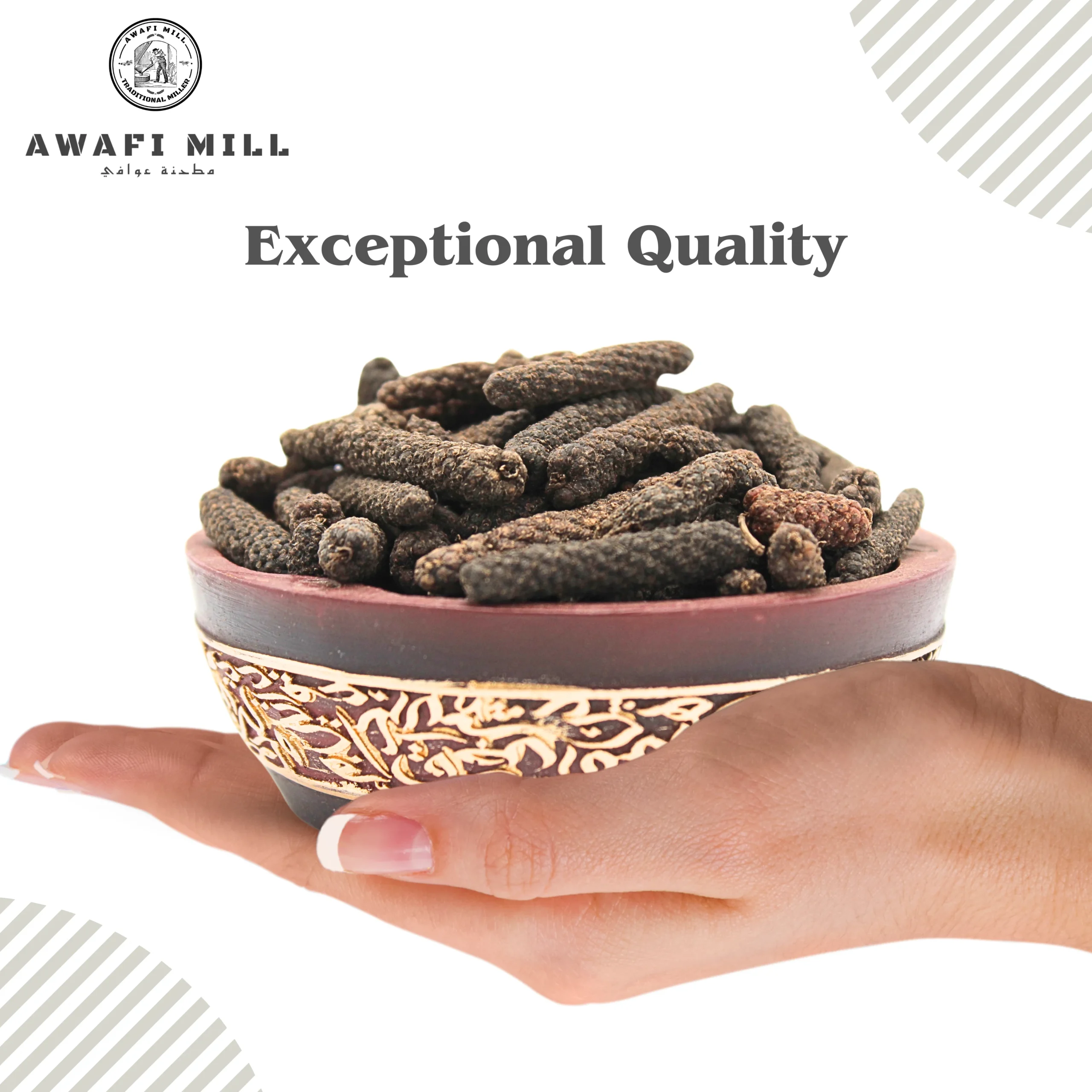 Awafi Mill Long Pepper, also known as Pippali or Thippilli, is a unique spice with bold, complex flavor. These dried pepper spikes are commonly used in Indian and Southeast Asian cuisine and traditional spice formulations for their aromatic and warming qualities.