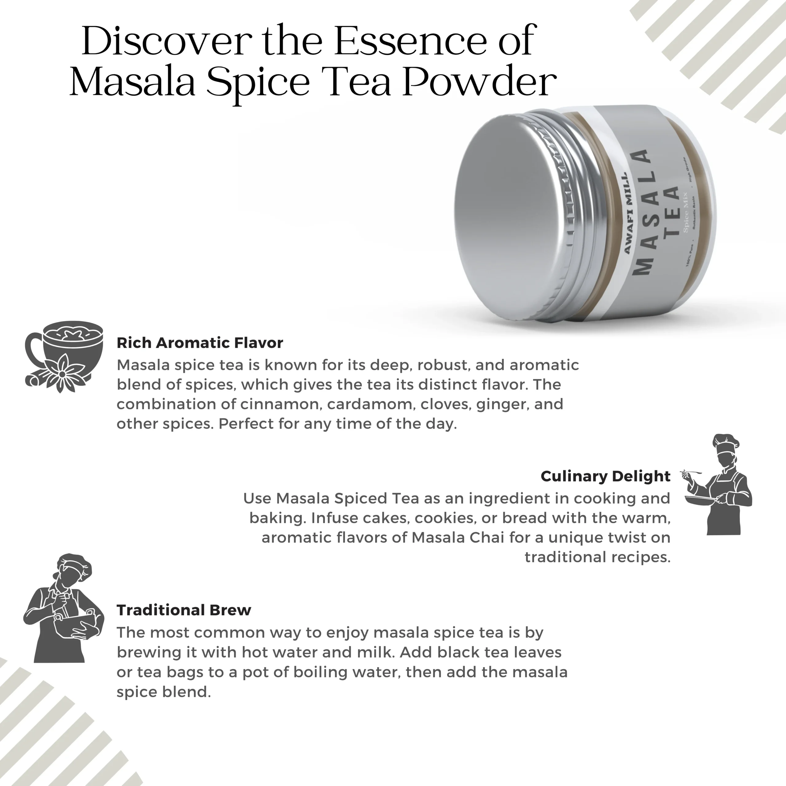 Awafi Mill Spice Masala Tea is a handcrafted chai blend combining fine tea leaves with aromatic spices like cardamom, cinnamon, clove, and ginger. This flavorful mix delivers a rich and comforting cup, perfect for daily brewing or special tea moments.