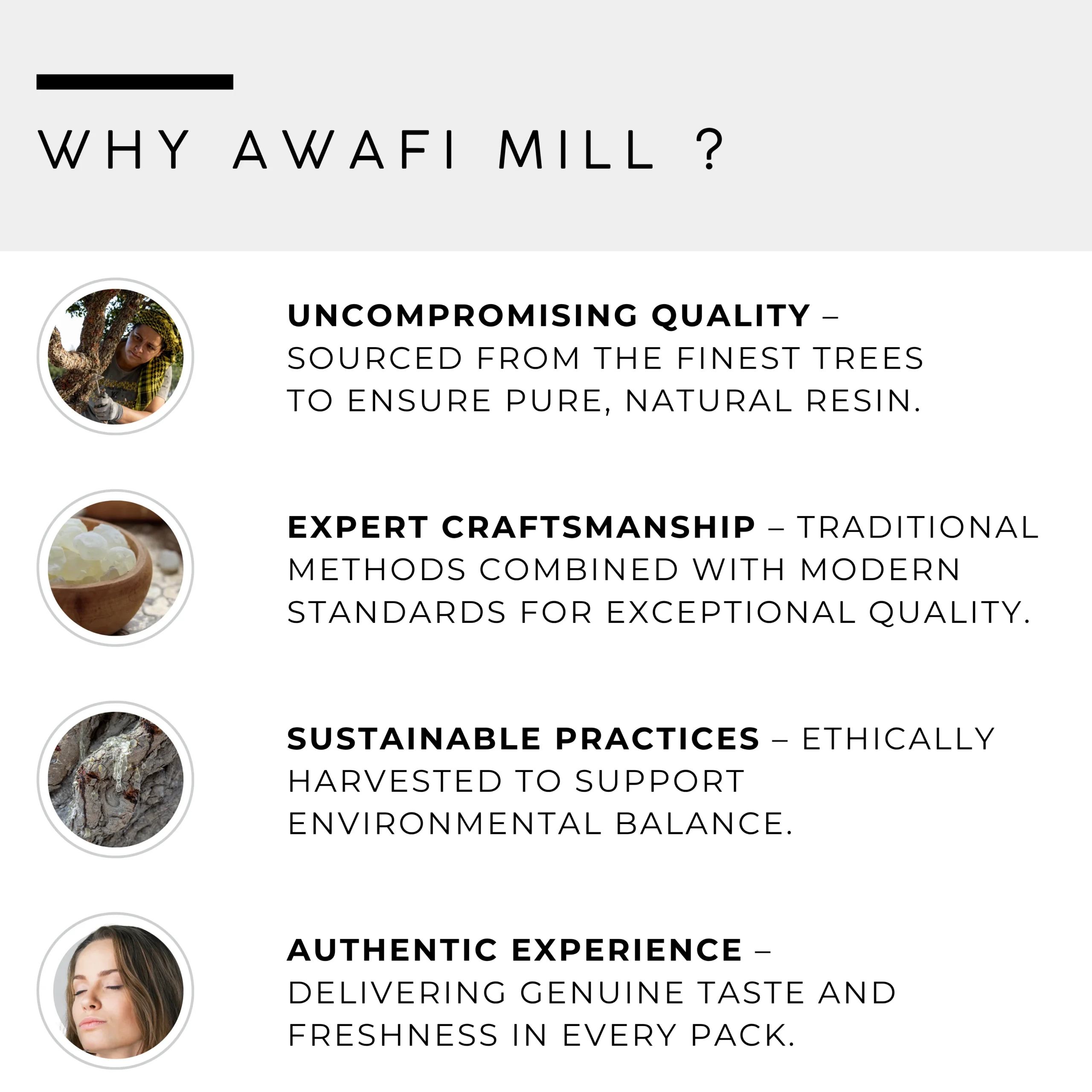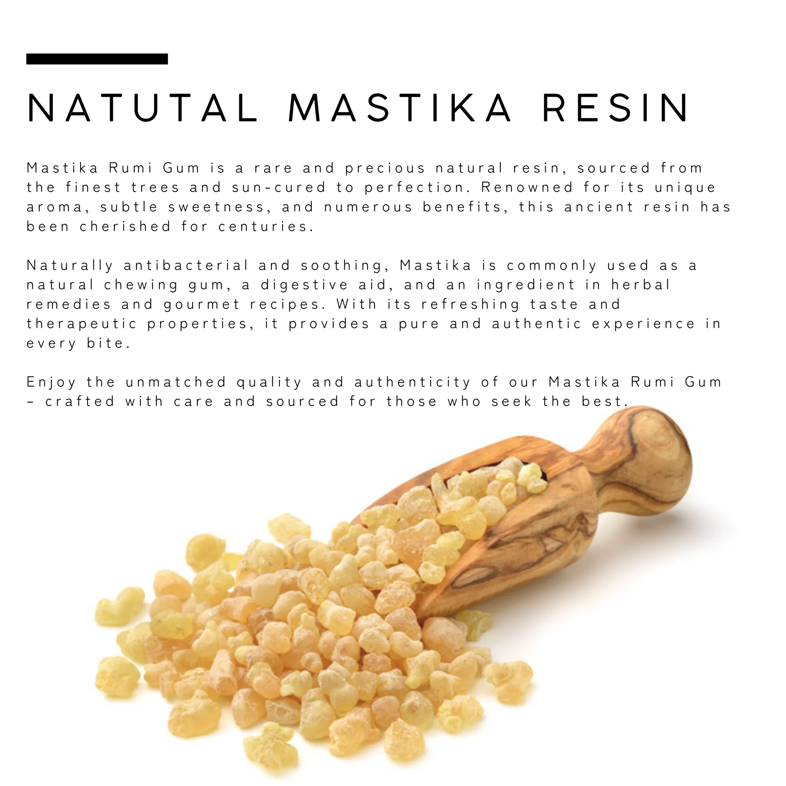 Awafi Mill Mastika Rumi Gum is a rare and precious natural resin, traditionally used as a natural chewing gum. Sourced from select trees and sun-cured to perfection, it offers a distinctive aroma, smooth texture, and a long-lasting chew. Widely valued in Middle Eastern and Mediterranean traditions.