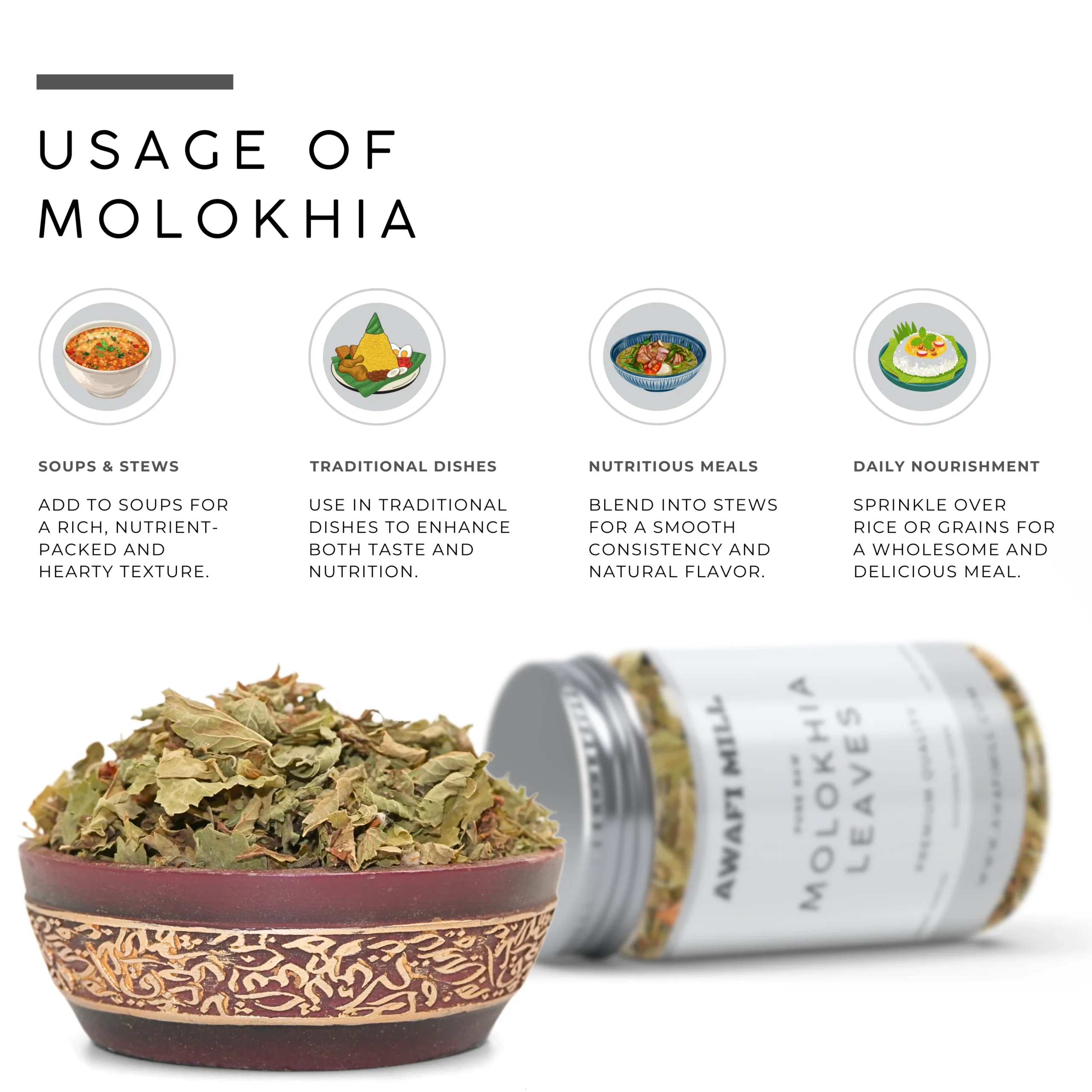 Awafi Mill Molokhia Leaves, also known as Jew’s Mallow, are carefully dried to preserve their natural taste and appearance. Popular in Egyptian, Levantine, and North African cuisine, these leaves are ideal for soups, stews, and traditional green sauces.