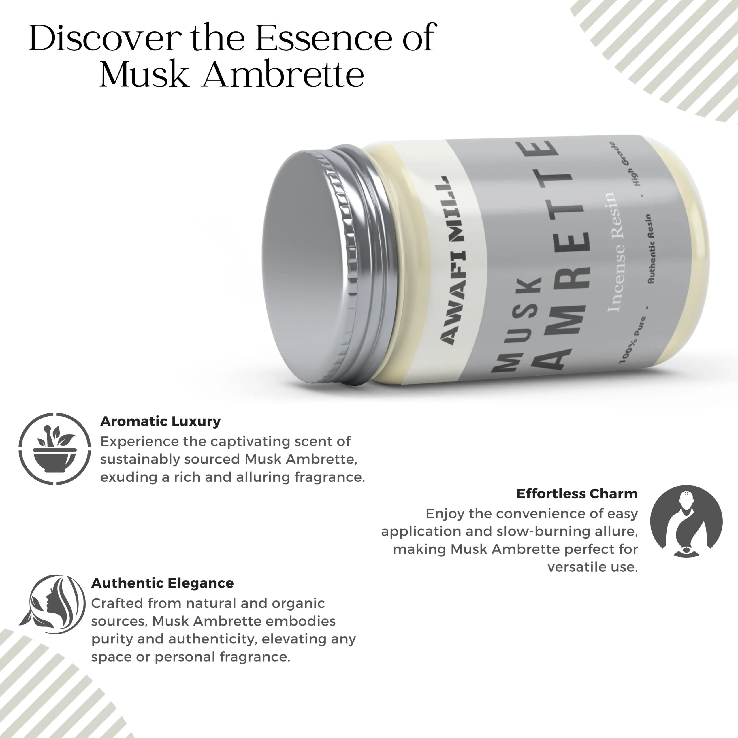 Awafi Mill Musk Ambrette Resin is a premium aromatic material known for its rich, musky-floral fragrance. Traditionally used in attars, incense, and artisanal perfume making, it blends well with other natural resins and oils to create deep, lasting scent profiles.