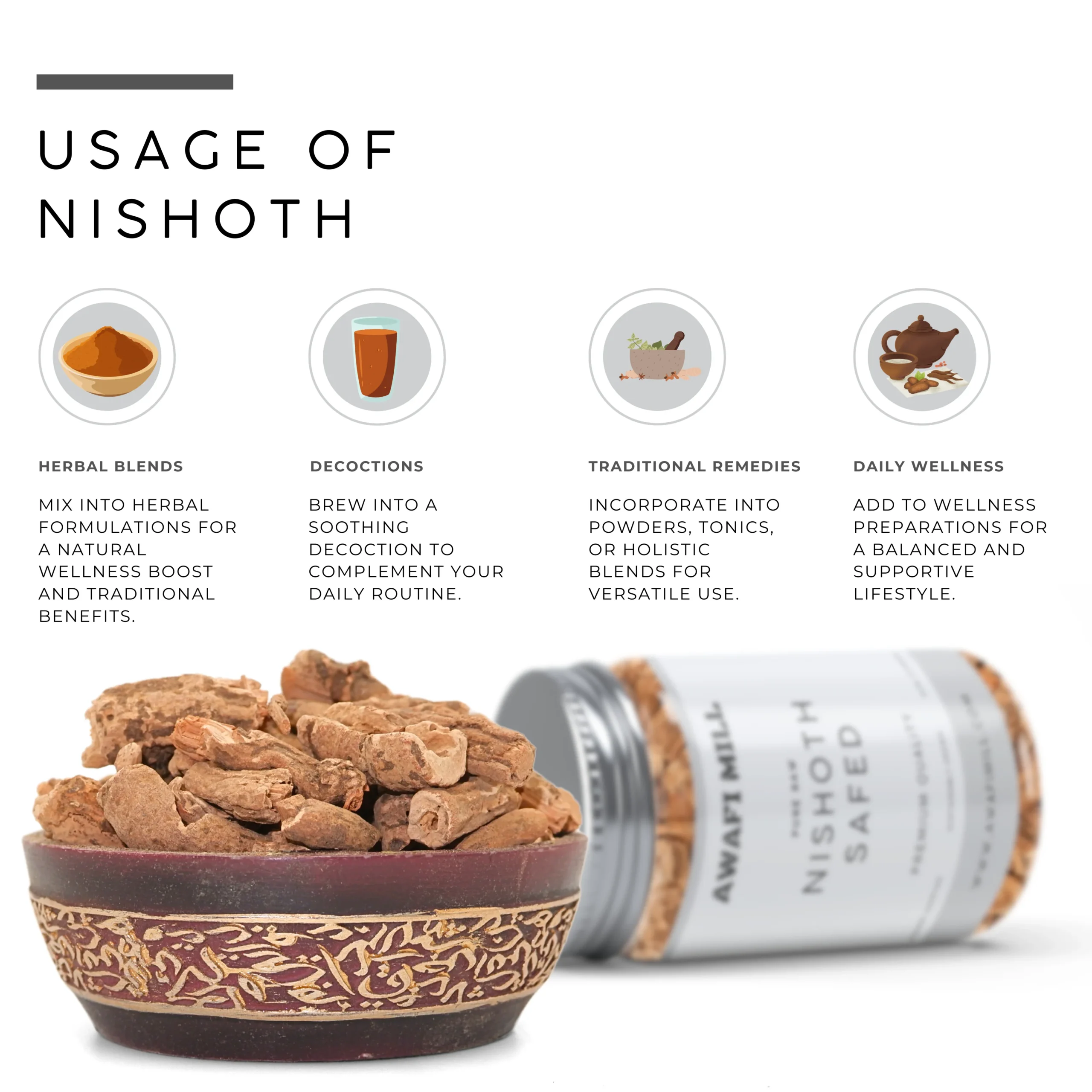 Awafi Mill Nishoth Safed, also known as Operculina turpethum, is carefully harvested and sun-dried to preserve its natural properties and firm structure. Traditionally valued in herbal practices, this root is used in wellness blends and cultural herbal preparations.