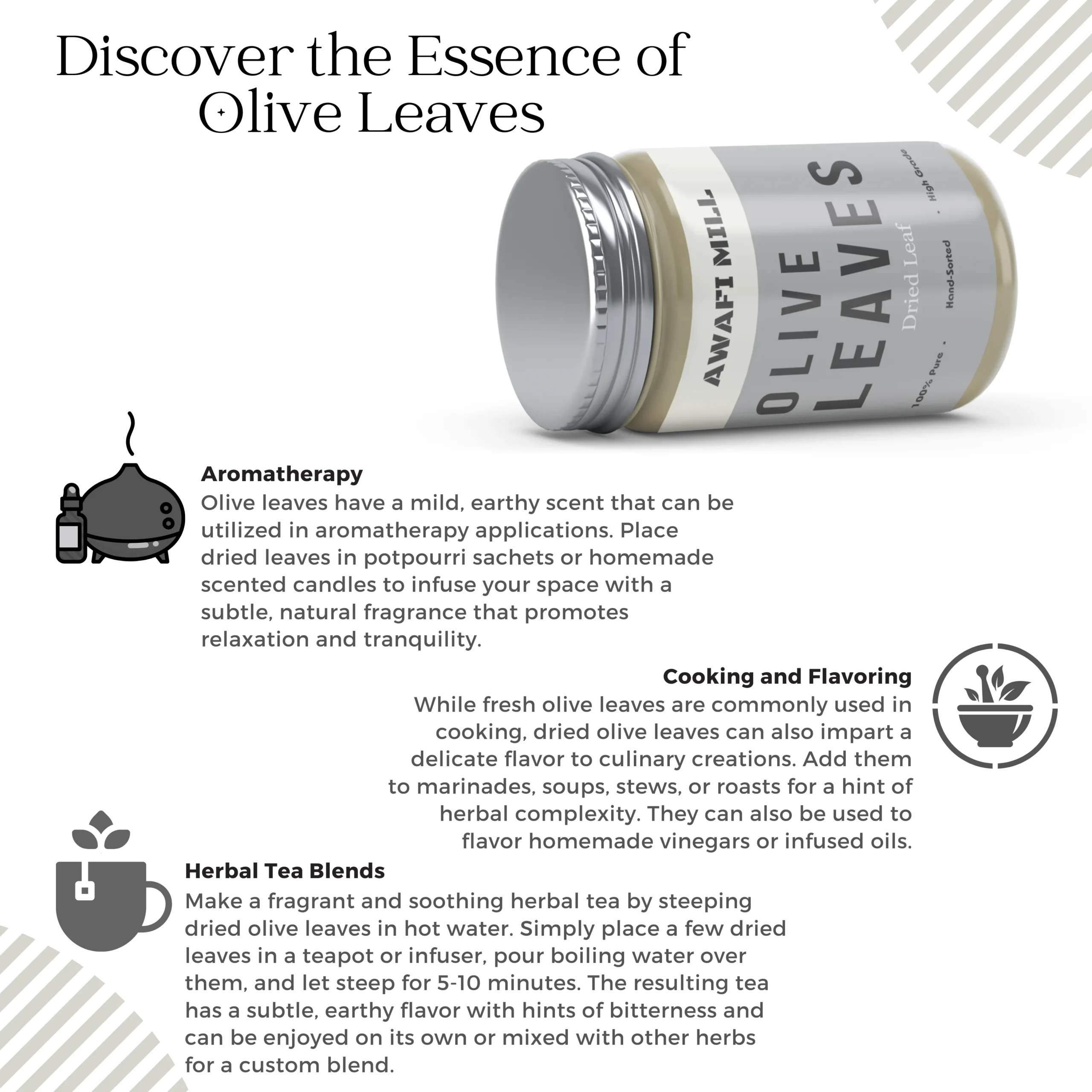 Awafi Mill Olive Leaves are carefully harvested from the Olea europaea tree and naturally dried to preserve their quality. Known for their use in herbal traditions, these leaves are suitable for infusions, decoctions, and botanical preparations.