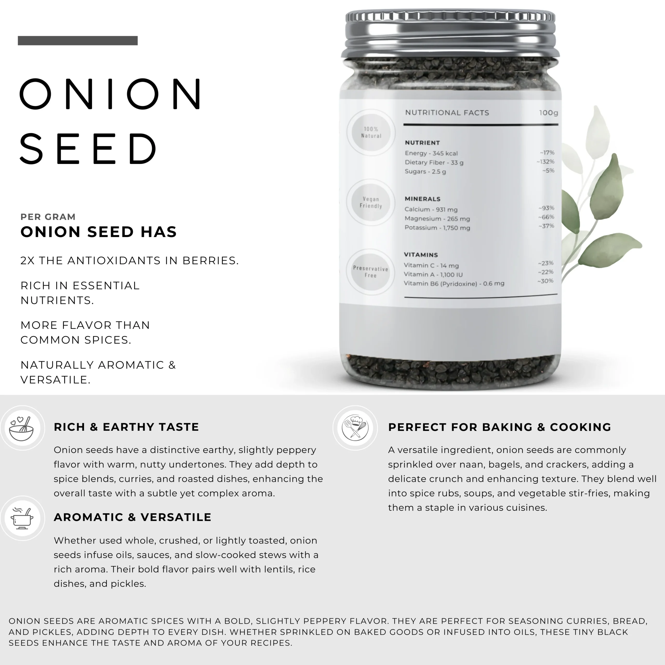 Awafi Mill Onion Seeds (Pyaz Beej) are naturally dried and hand-selected for purity and flavor. These aromatic black seeds are often used in traditional spice blends, pickles, and savory dishes for their subtle earthy flavor and crunch.