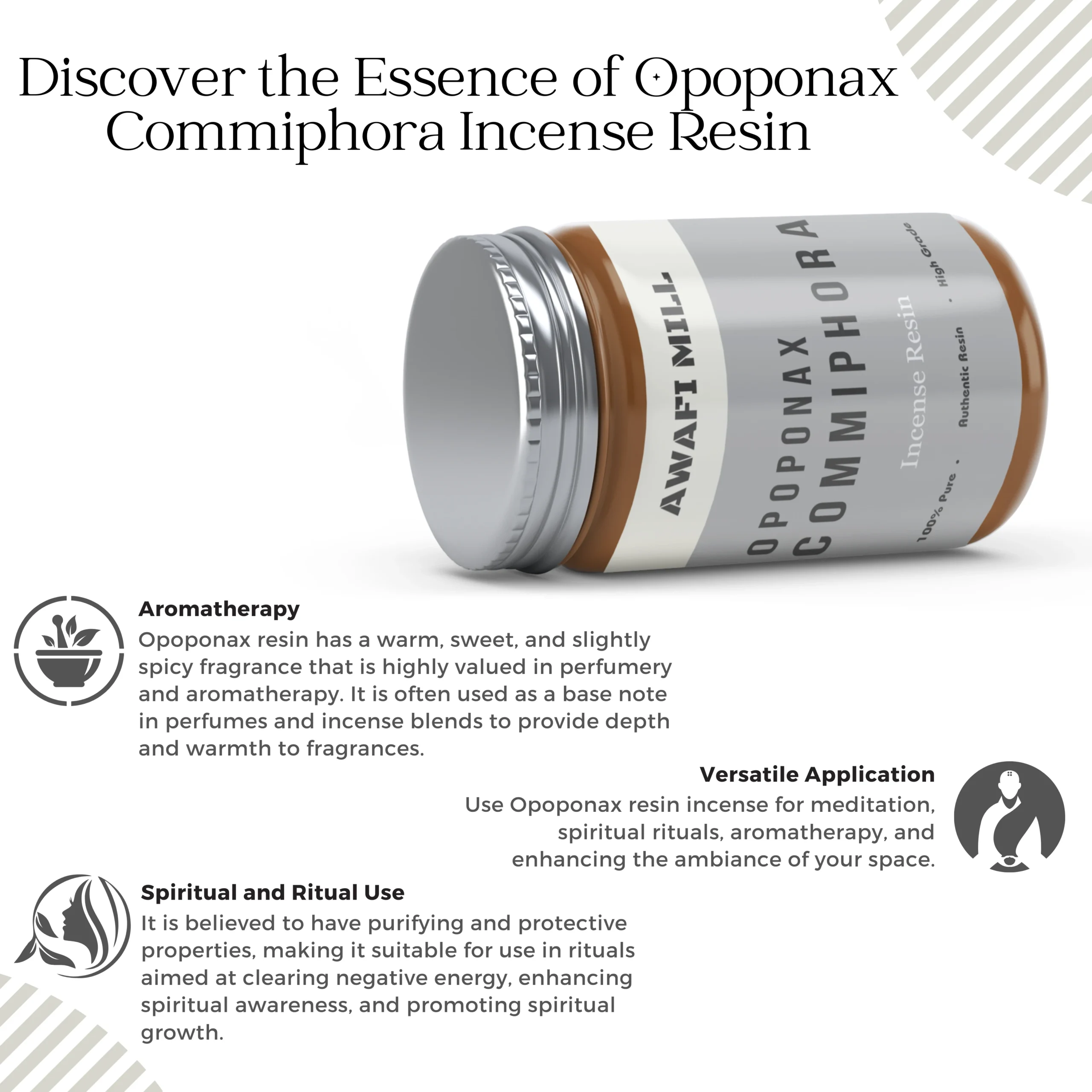 Awafi Mill Opoponax Resin is a fragrant natural gum obtained from the Commiphora species, often referred to as ?sweet myrrh.? Known for its rich, warm, and slightly sweet scent, it?s a treasured ingredient in incense making, perfumery, and traditional rituals. Burns smoothly, releasing a comforting, deep aroma.
