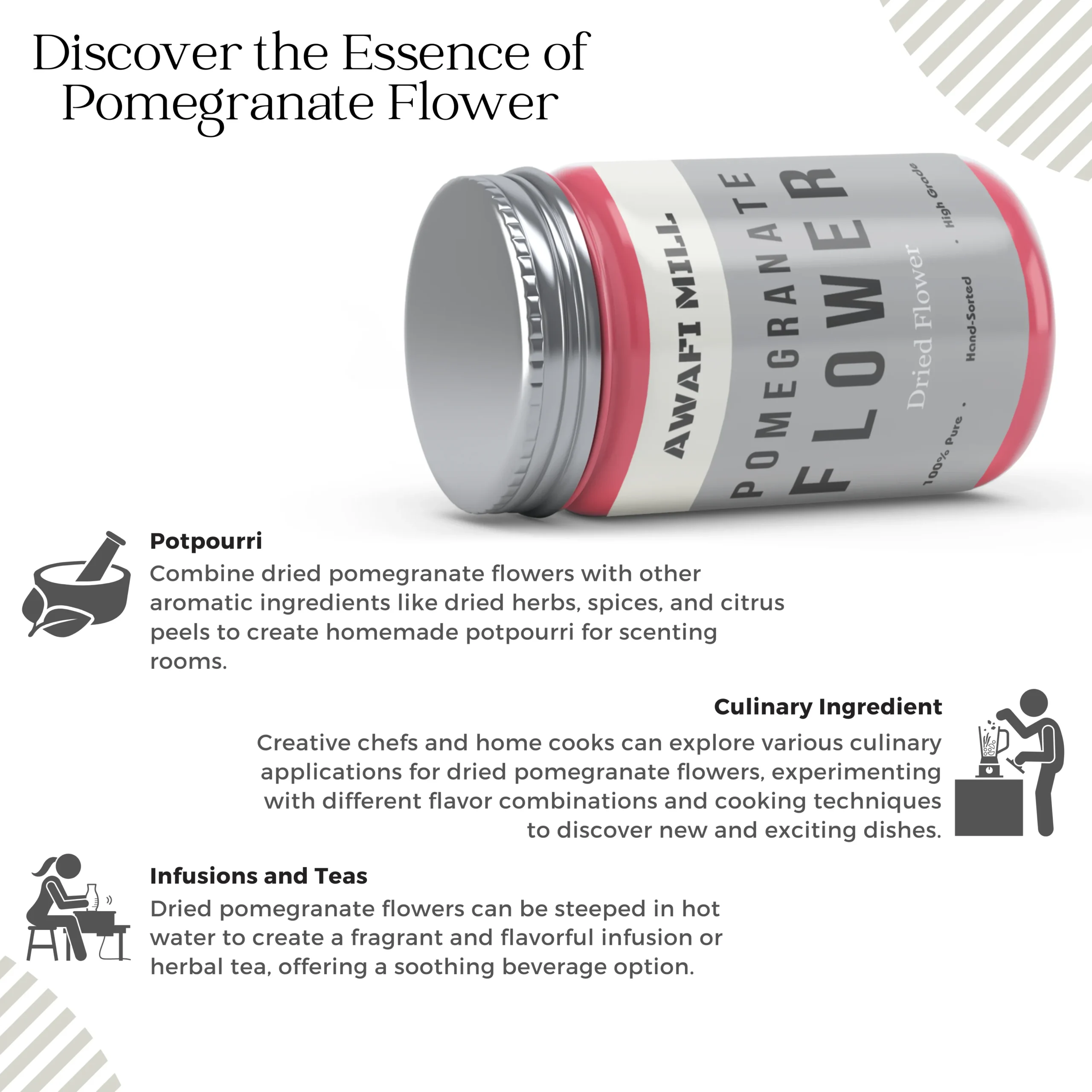 Awafi Mill Pomegranate Flower is carefully dried from Punica granatum blossoms, prized for their deep red hue and gentle, tangy-floral aroma. Often used in herbal tea blends, natural wellness infusions, and traditional preparations, these flowers add beauty, color, and depth to every mix.
