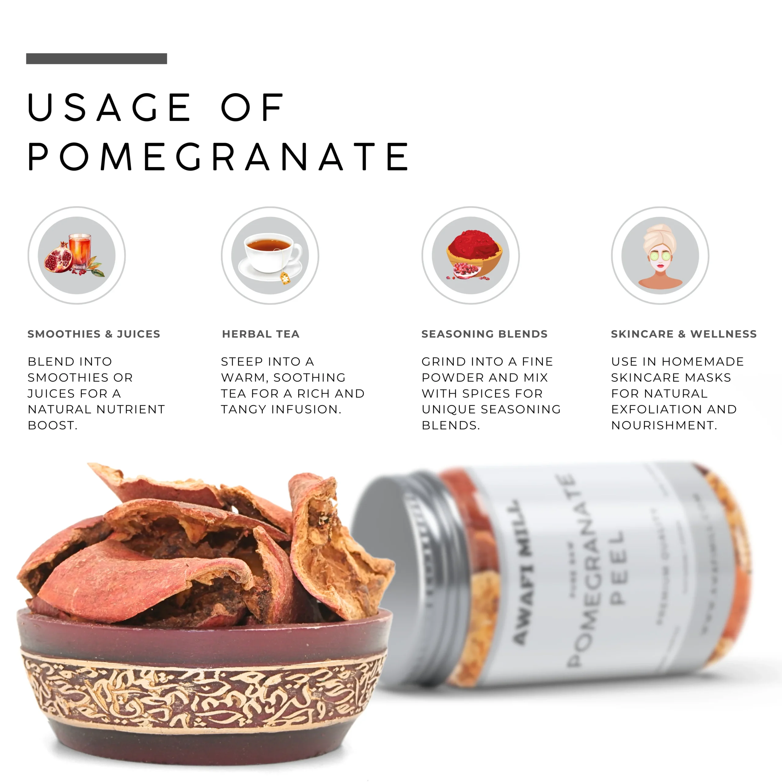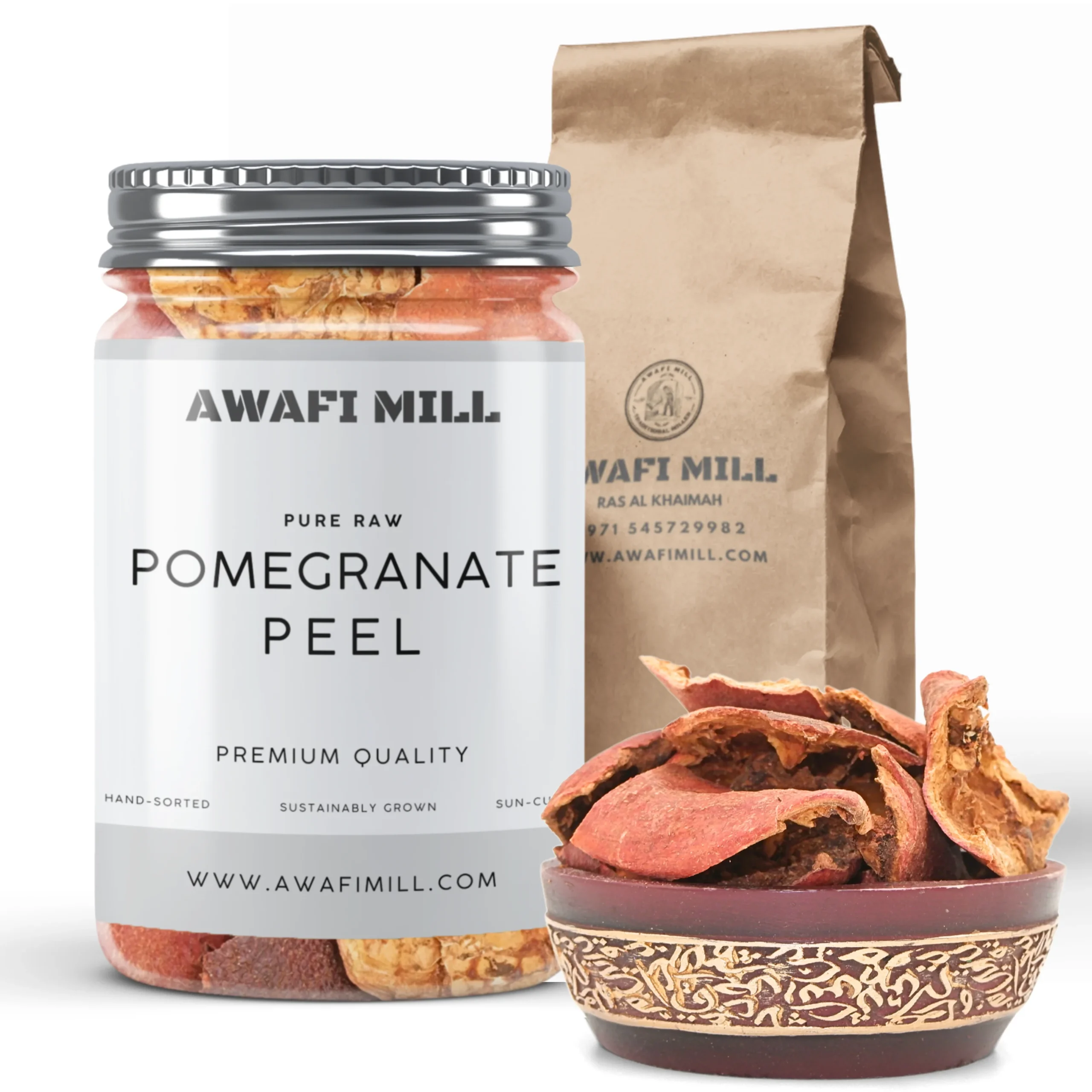 Awafi Mill Pomegranate Peel is made from select pomegranate rinds that are naturally sun-dried to preserve their deep color, tangy-sour taste, and beneficial properties. Traditionally used in herbal teas, spice mixes, and wellness blends, this peel is a versatile botanical ingredient in kitchens and herbal practices.