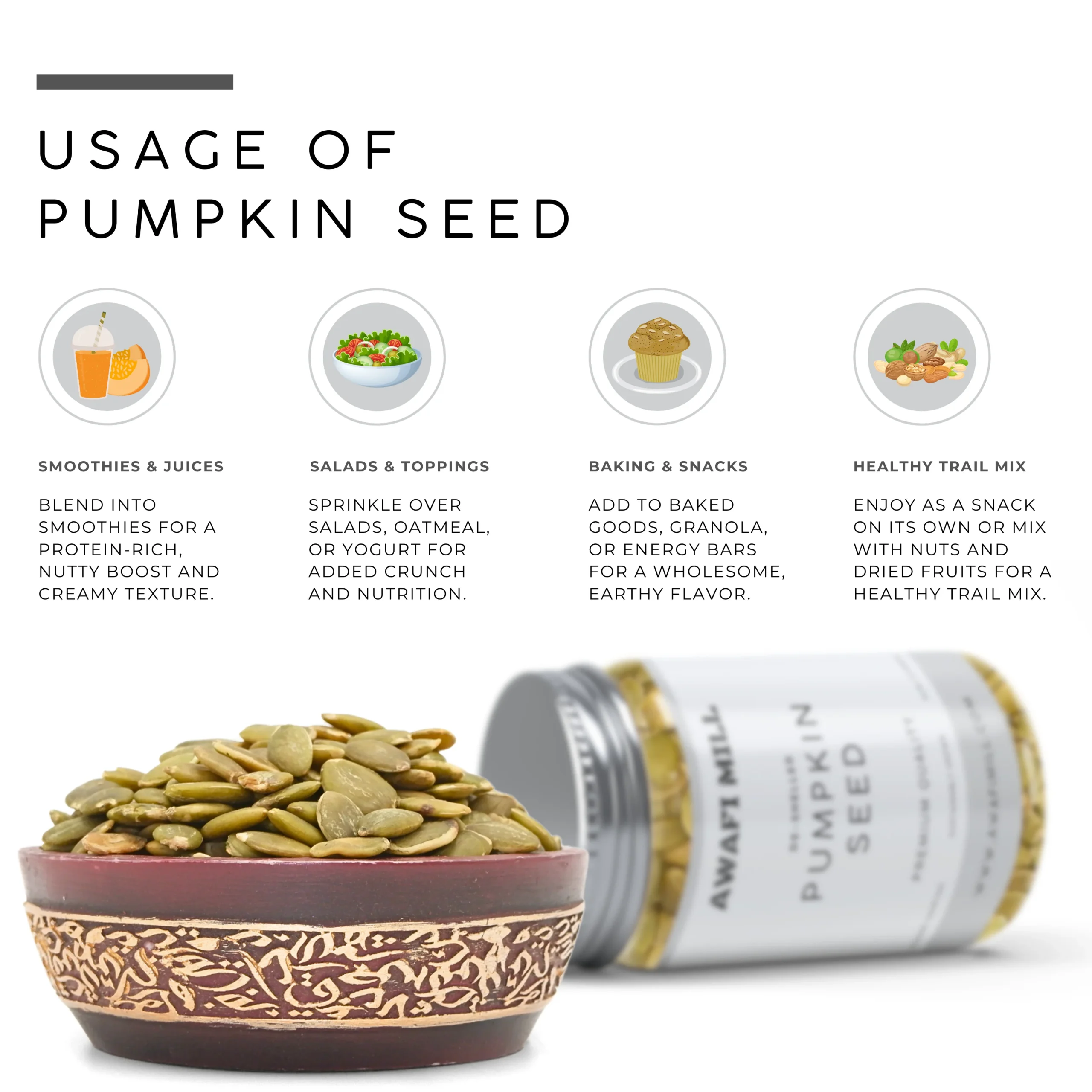 Awafi Mill Pumpkin Seeds (Pepitas) are flat, oval-shaped seeds with a subtle nutty flavor. Perfect for snacking, adding crunch to salads, or blending into baking recipes and healthy snacks.