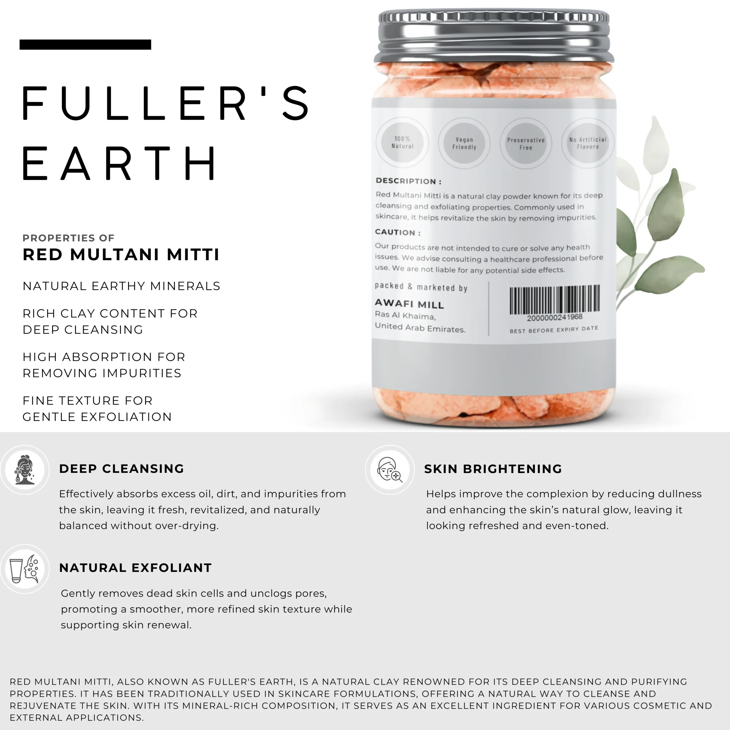 Awafi Mill Red Multani Mitti comes in raw, natural chunks known for their oil-absorbing and deep cleansing properties. Widely used in traditional skincare, this clay helps purify the skin and improve texture naturally.