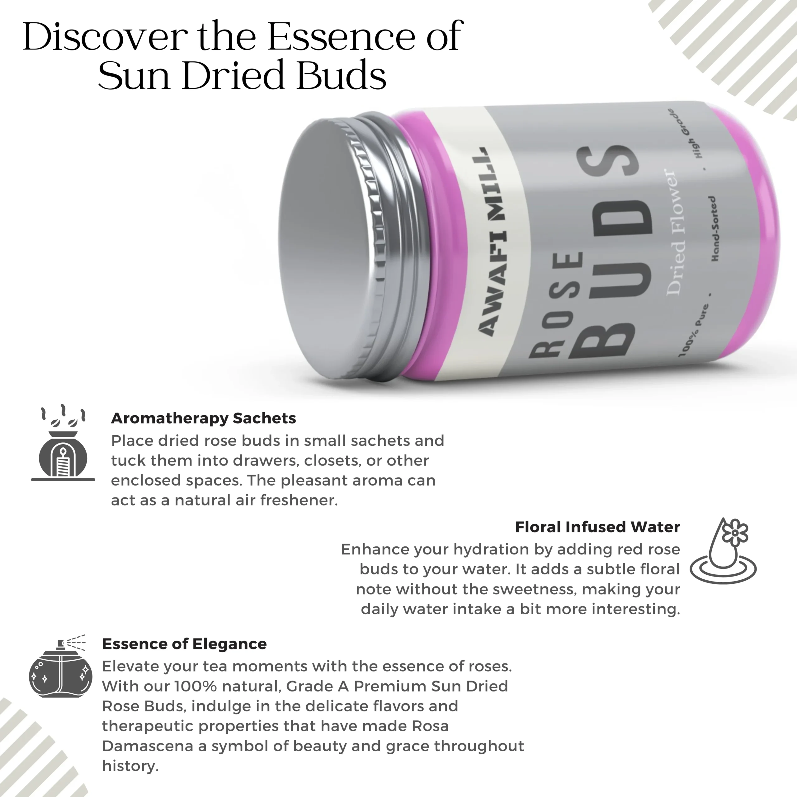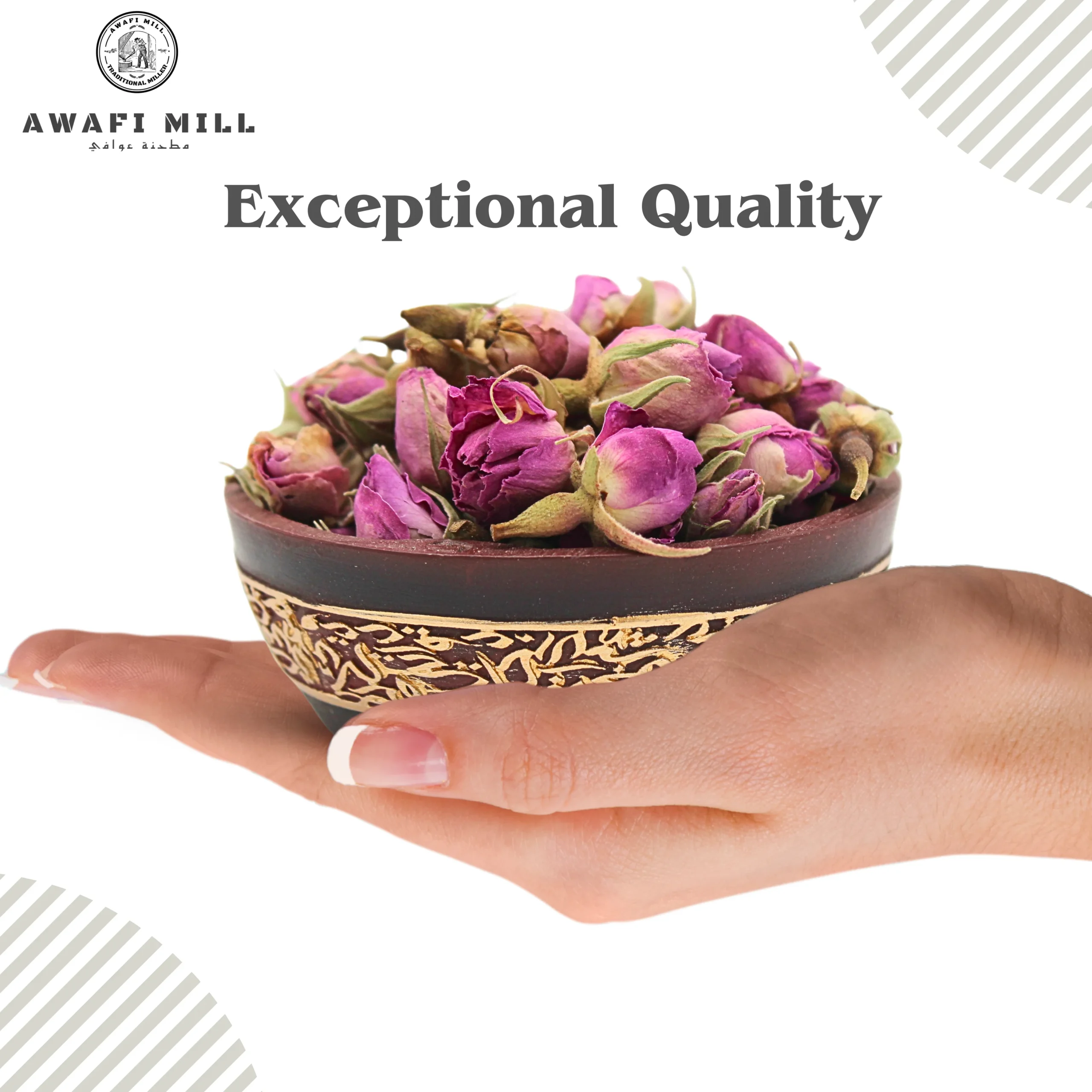 Awafi Mill Rose Buds Tea features handpicked dried rose buds known for their gentle fragrance and calming properties. Naturally caffeine-free, this floral infusion is ideal for relaxation, evening sips, or blending with other herbal teas. A soothing and elegant choice for daily wellness and aromatic enjoyment.