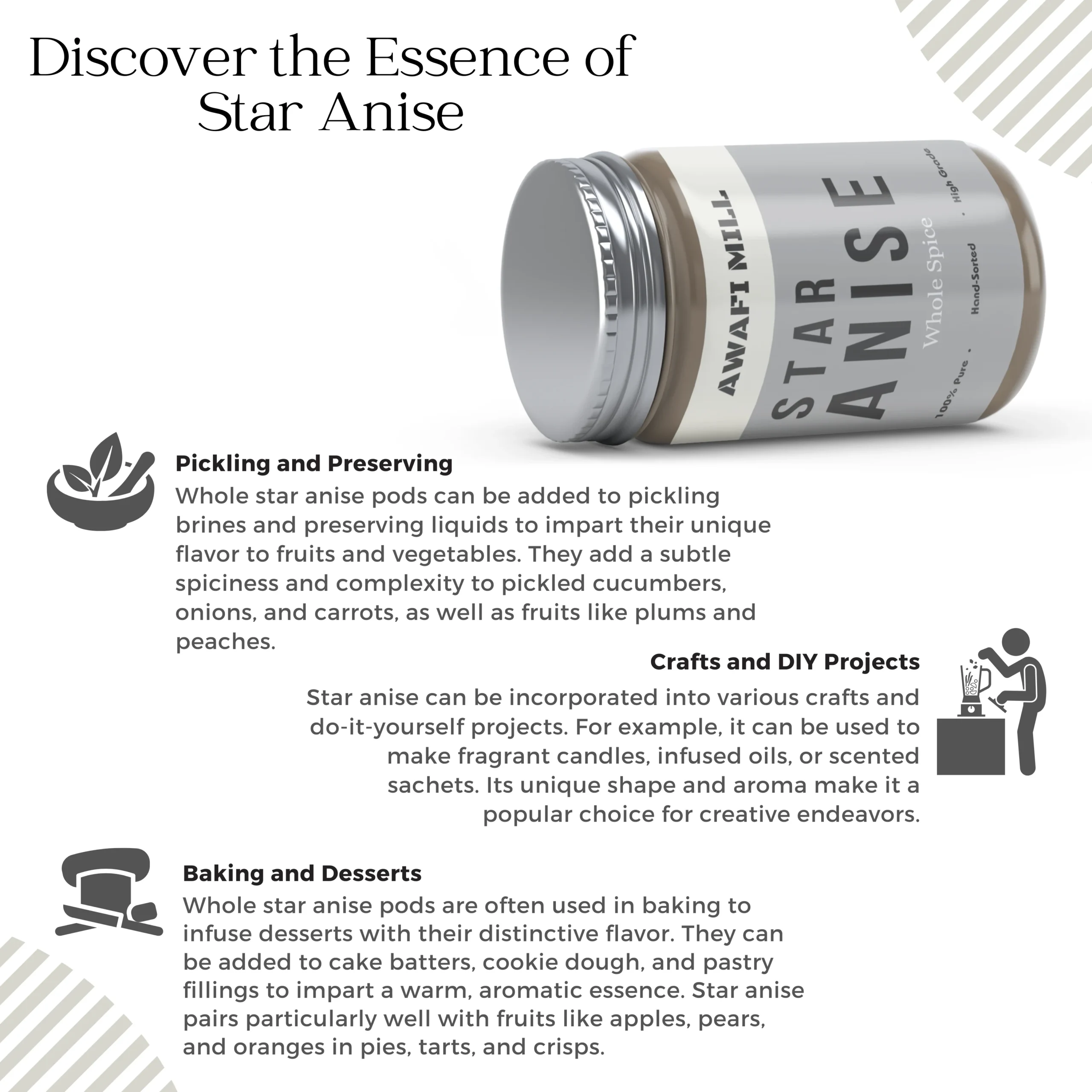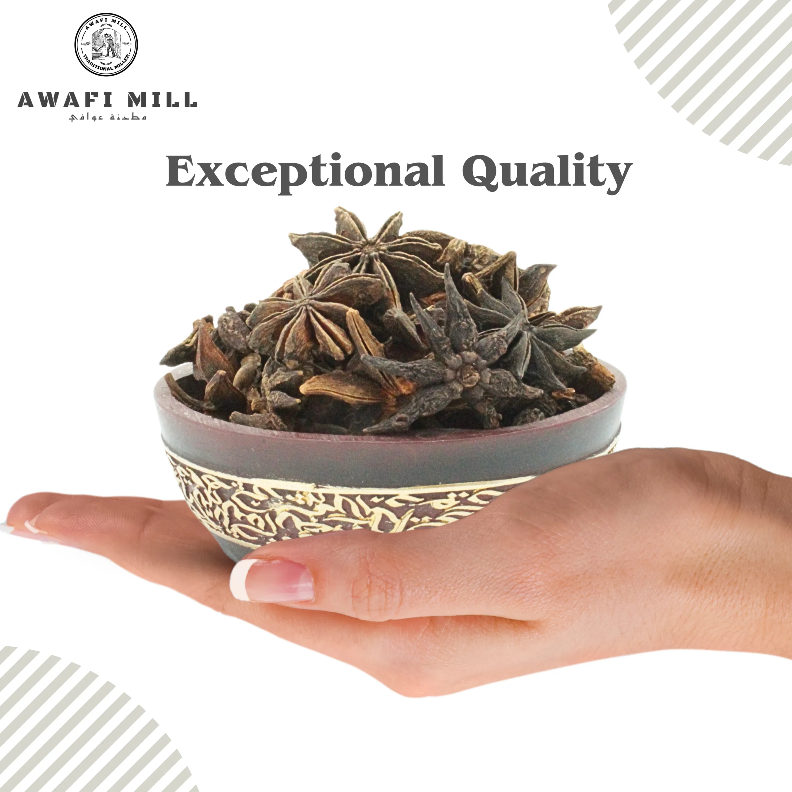 Awafi Mill Star Anise is a premium-grade whole spice sourced from Illicium verum. With its distinctive star shape and naturally sweet-spicy fragrance, it enhances a variety of culinary creations, from Asian broths and marinades to baked goods and infusions.
