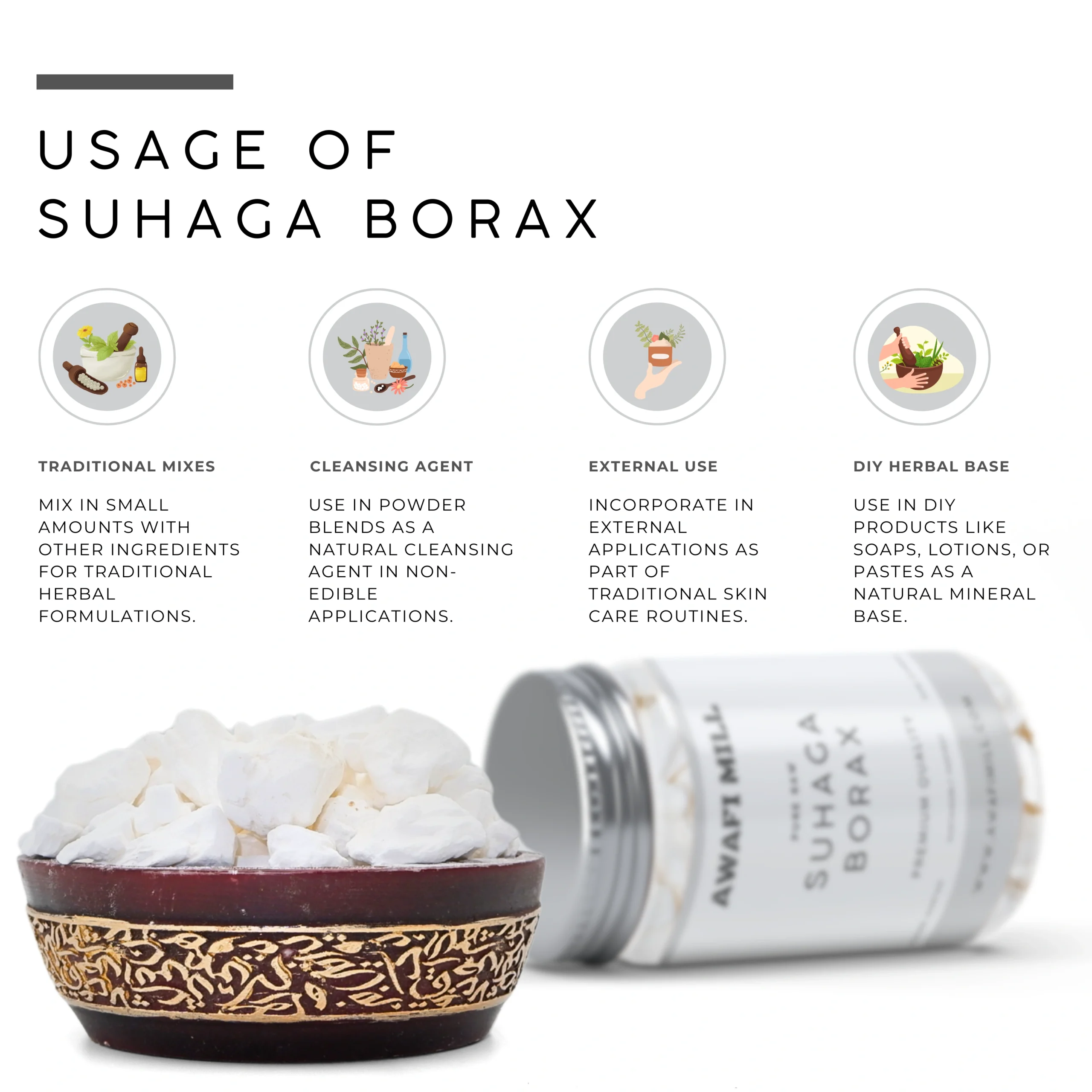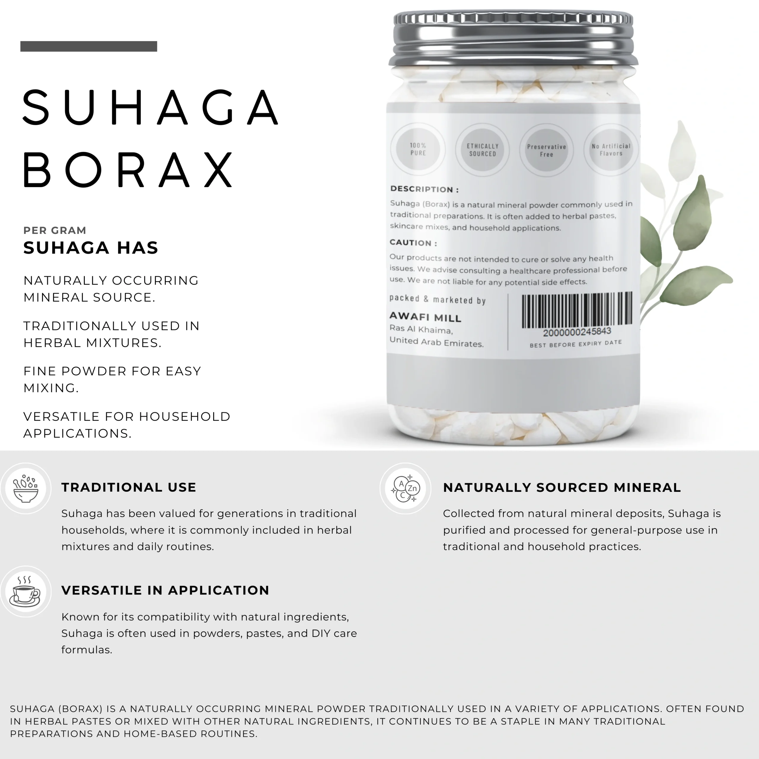 Awafi Mill Suhaga Borax is naturally formed crystal borax, valued in traditional applications. Gently processed and cleaned for versatile home and cultural use.