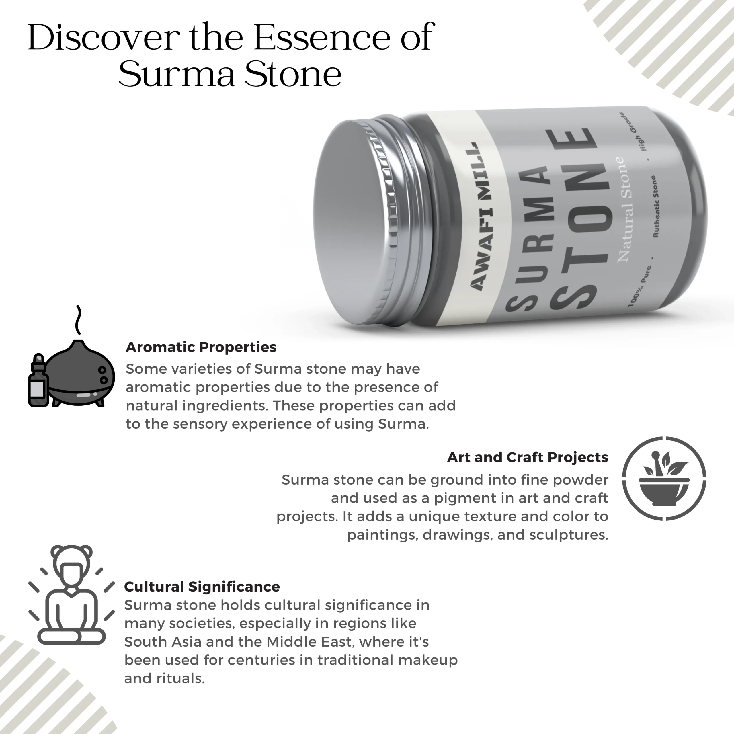 Awafi Mill Surma Stone, also known as Kohl Stibnite, is a naturally sourced mineral valued for its use in traditional kohl preparation. Finely ground into a silky black powder, it’s used in cultural rituals and cosmetics.