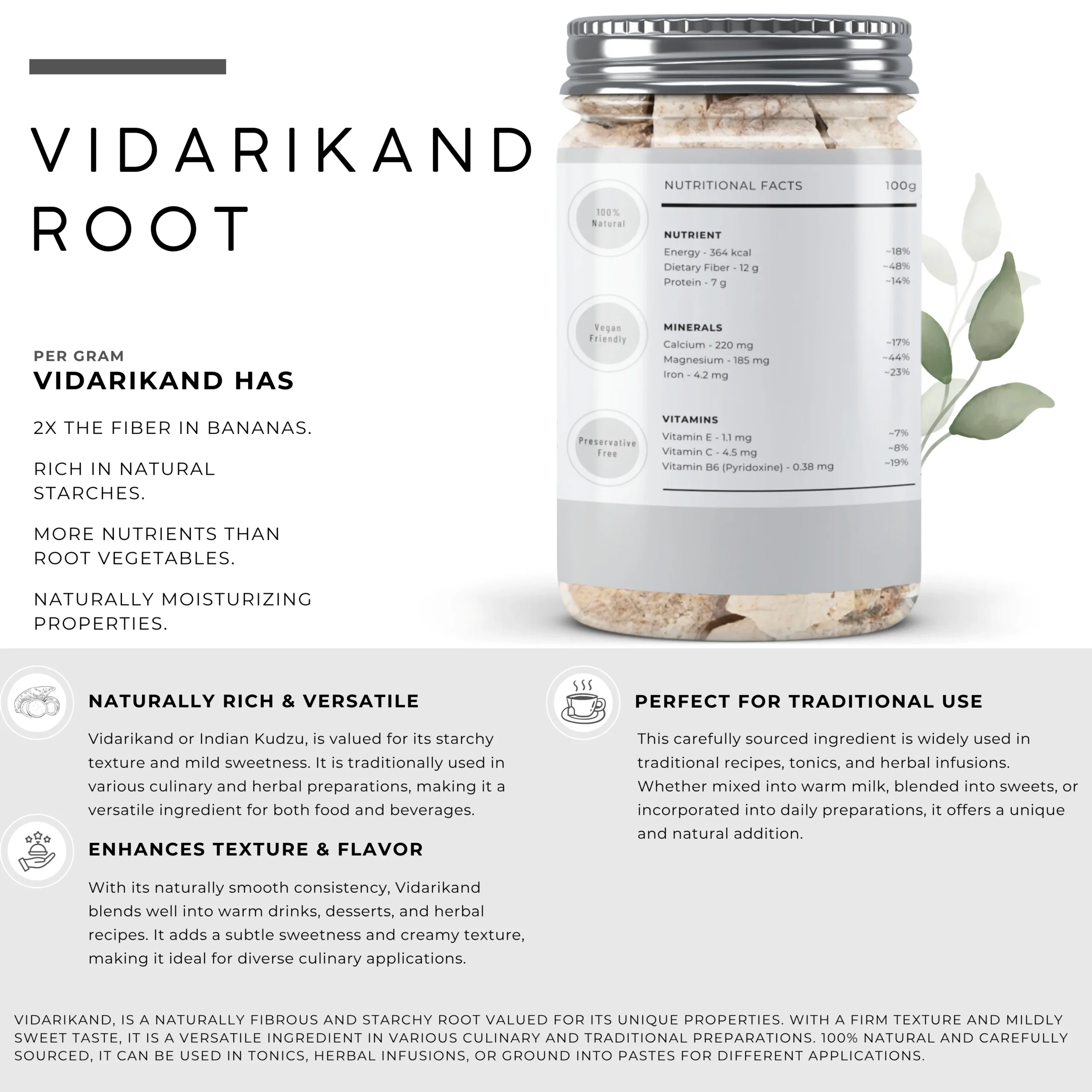 Awafi Mill Vidarikand Root, also known as Pueraria tuberosa, is carefully sourced and naturally dried to preserve its natural properties and firm structure. Traditionally valued in herbal practices, this root is used in wellness blends, natural preparations, and cultural herbal remedies.