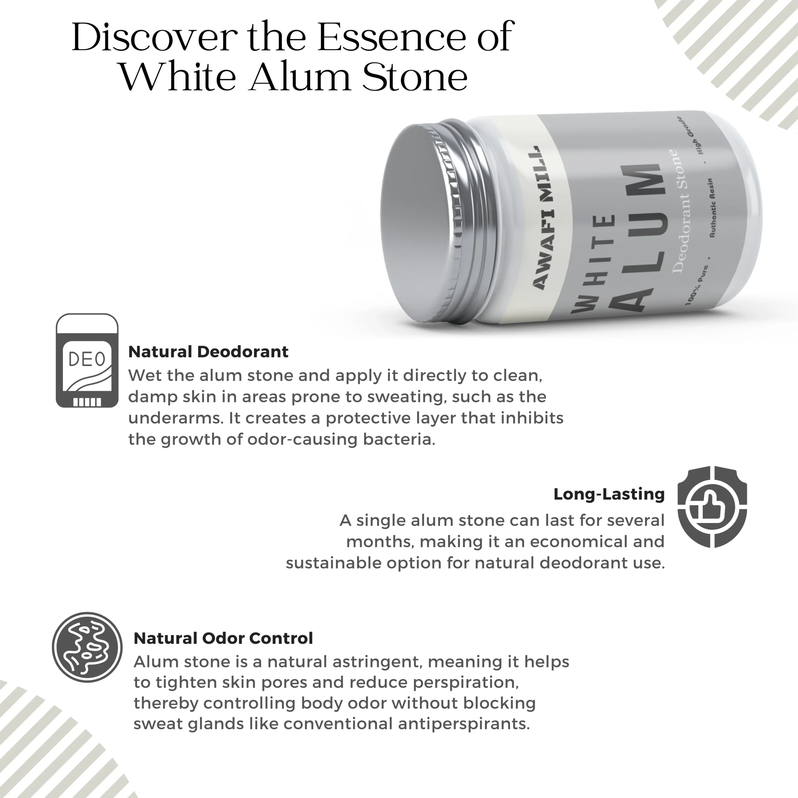 Awafi Mill White Alum Stone Powder is made from pure, natural alum crystals ground into a fine, smooth powder. Known for its deodorizing and astringent properties, it’s commonly used as a traditional underarm deodorant, post-shave treatment, and skin-soothing remedy. Free from fragrance and chemicals.
