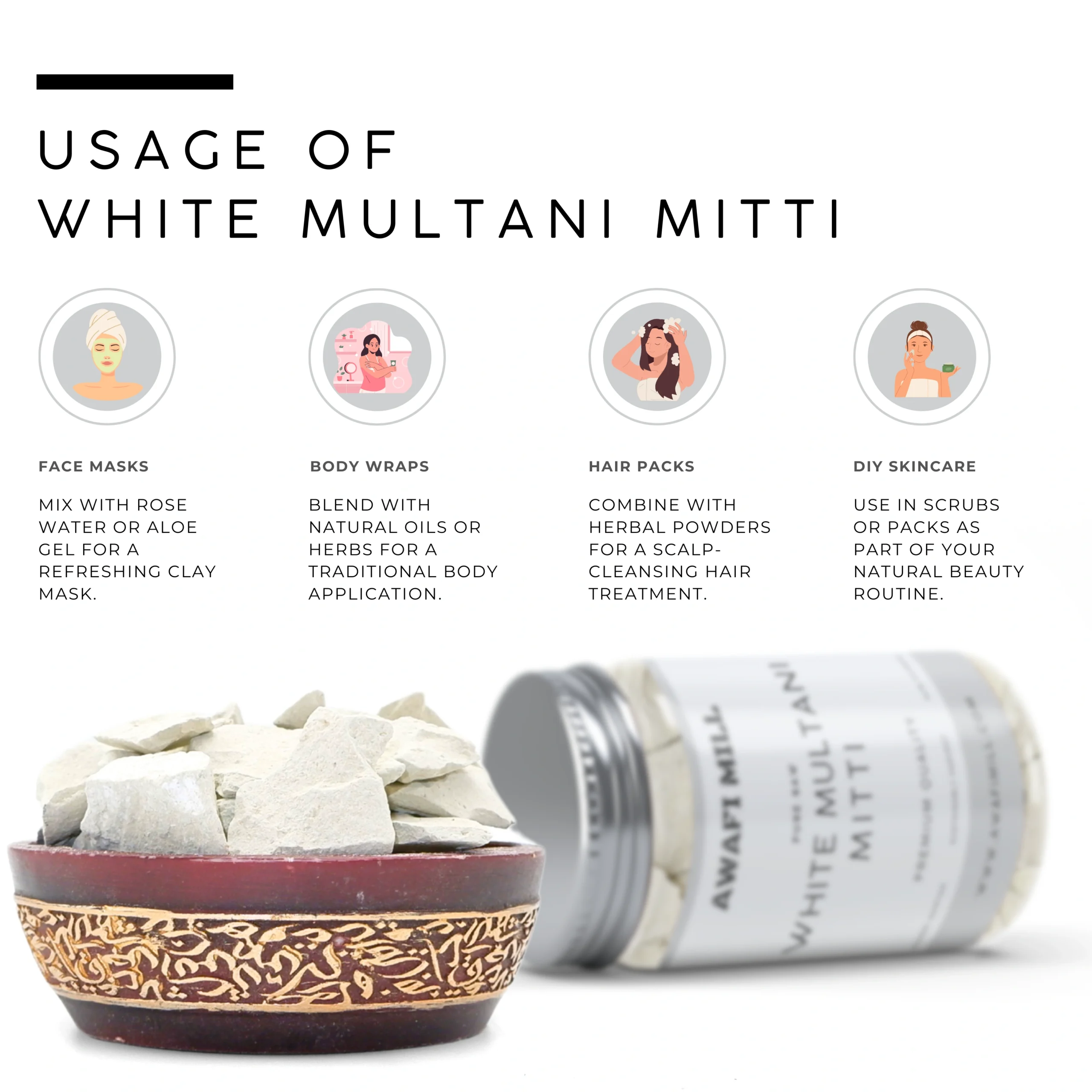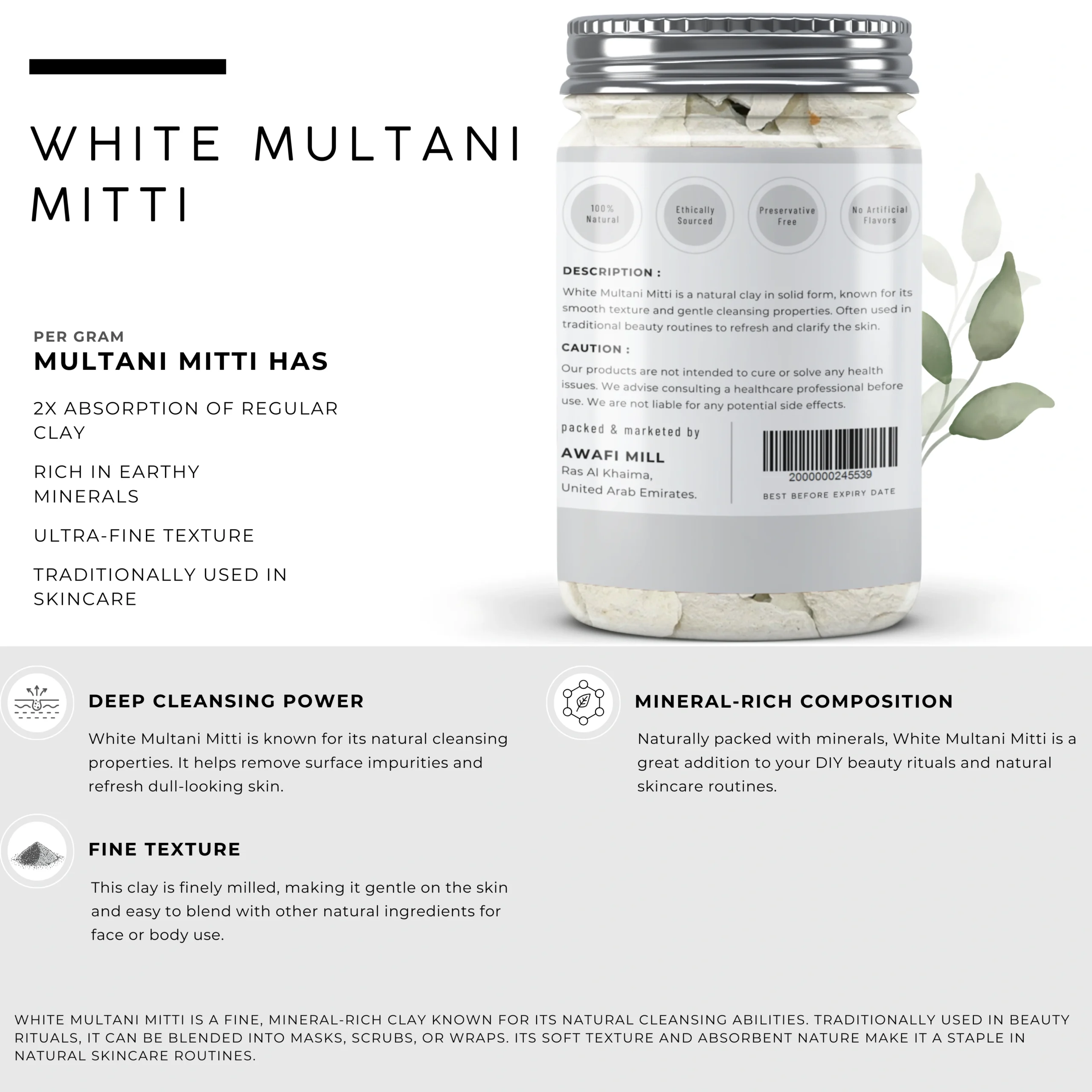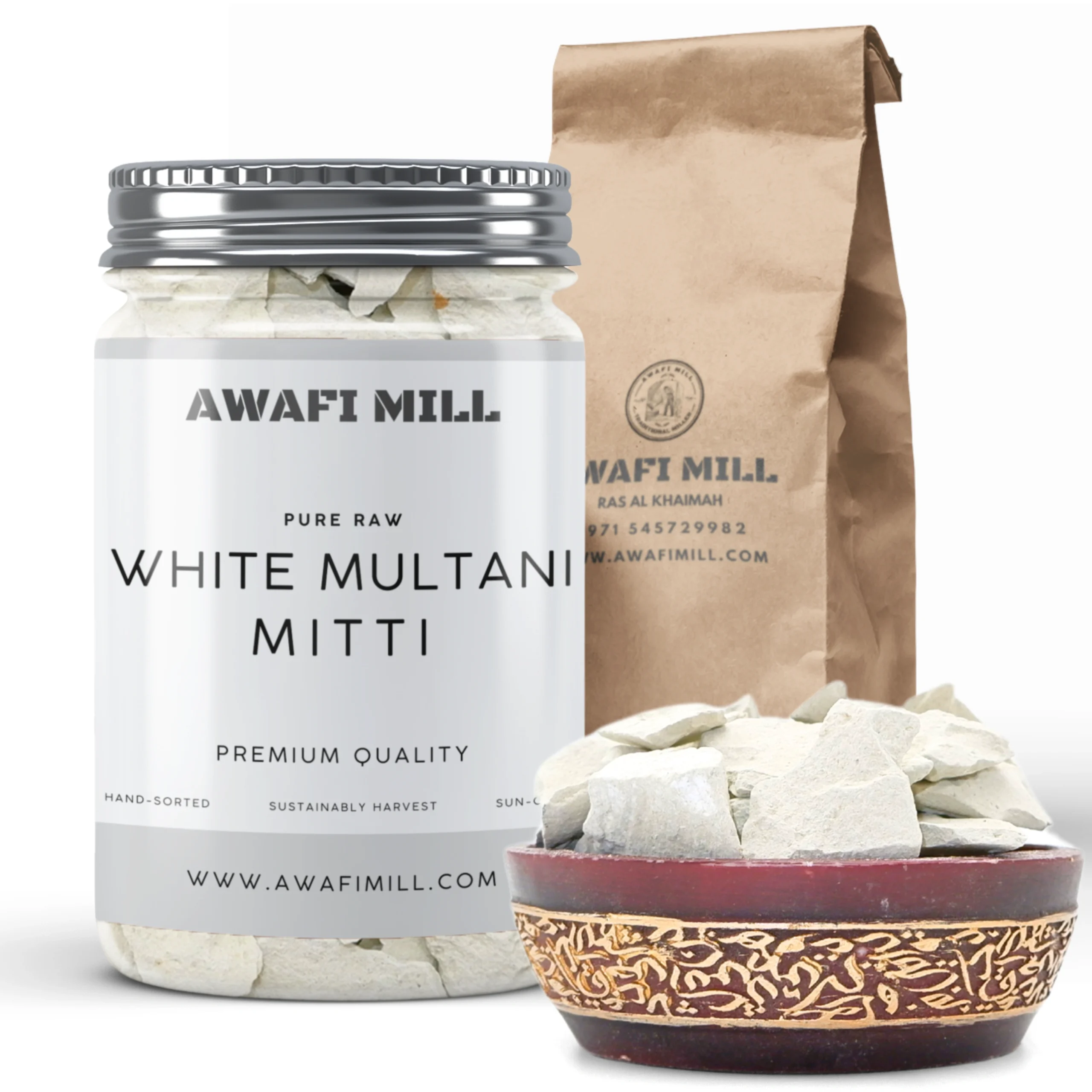 Awafi Mill White Multani Mitti comes in natural stone form, known for its oil-absorbing and skin-purifying properties. Ideal for DIY face masks and traditional skin detox practices.