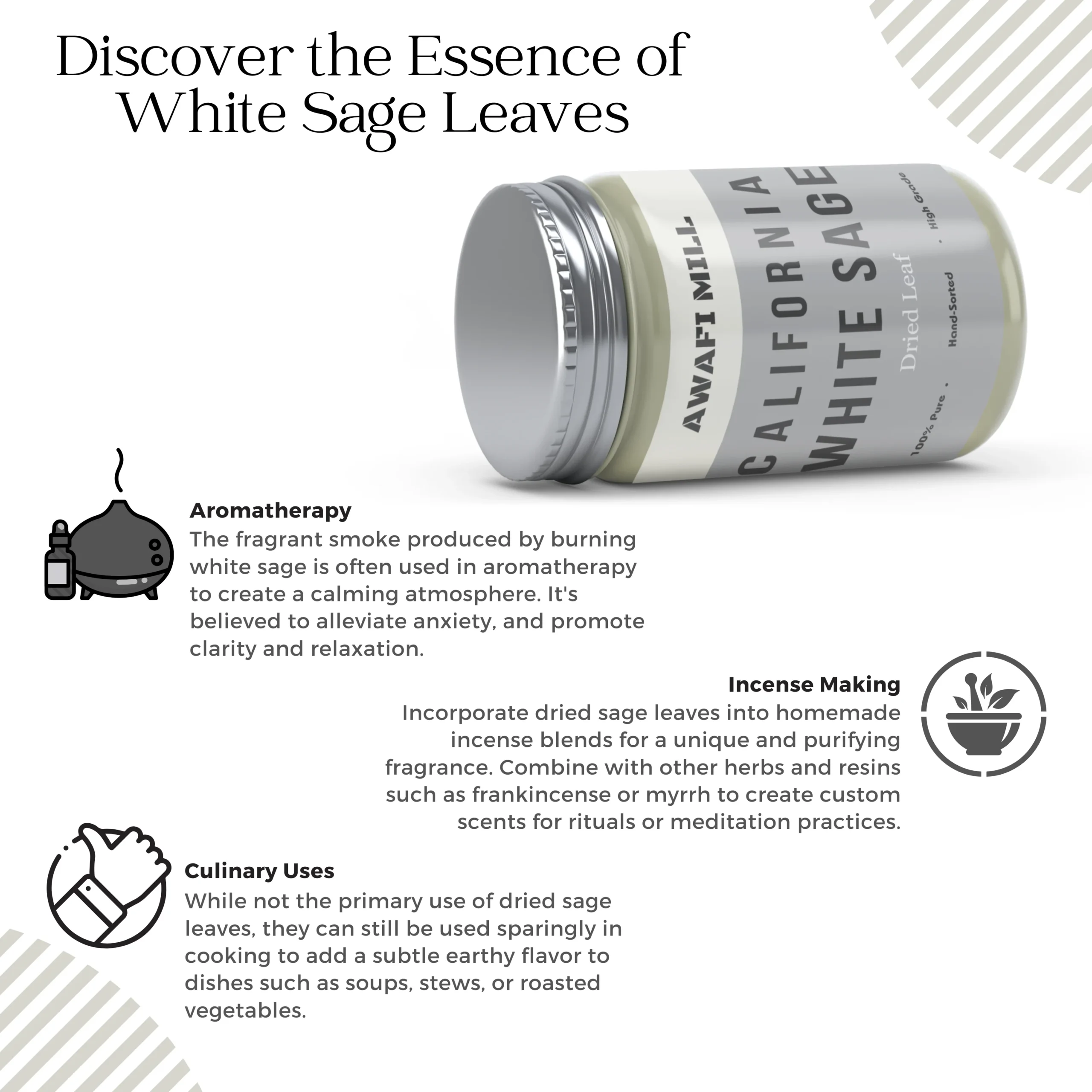 Awafi Mill White Sage Leaves are carefully selected from Salvia officinalis plants and gently dried to preserve their crisp texture and distinctive aroma. Widely valued for traditional practices and aromatic use, these leaves are ideal for cleansing rituals, incense, and natural blends.