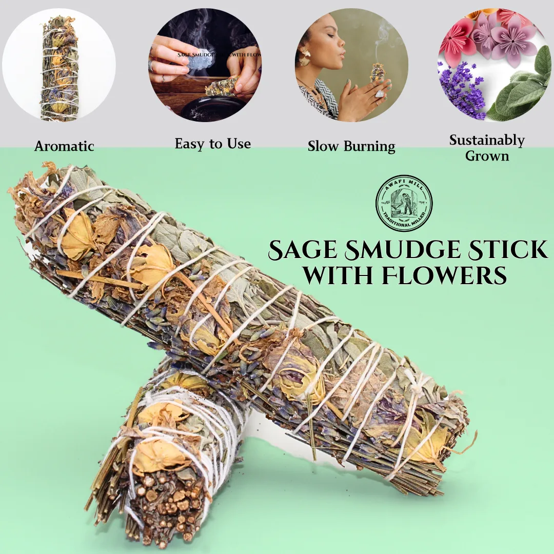 Awafi Mill’s White Sage with Flowers Smudge Stick combines the earthy essence of sage with the delicate beauty of assorted dried flowers. This handcrafted bundle is ideal for enhancing spiritual rituals, adding natural fragrance, or displaying as a botanical accent in any space.