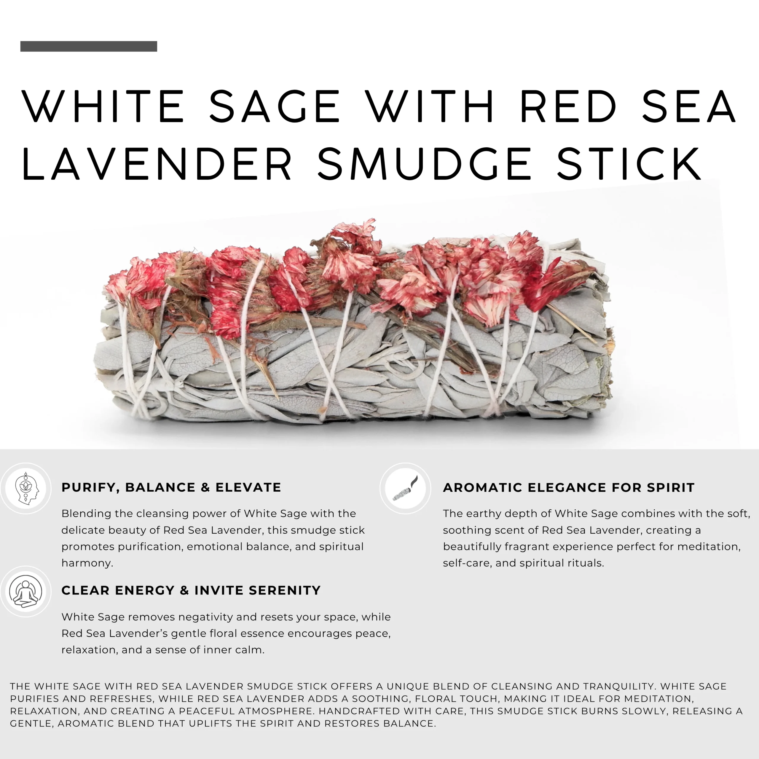 Awafi Mill’s White Sage with Red Sea Lavender Floral Smudge Stick combines the cleansing nature of white sage with the vibrant beauty of red sea lavender. Hand-tied and naturally dried, this smudge bundle is a striking addition to rituals, meditation spaces, or decorative displays.