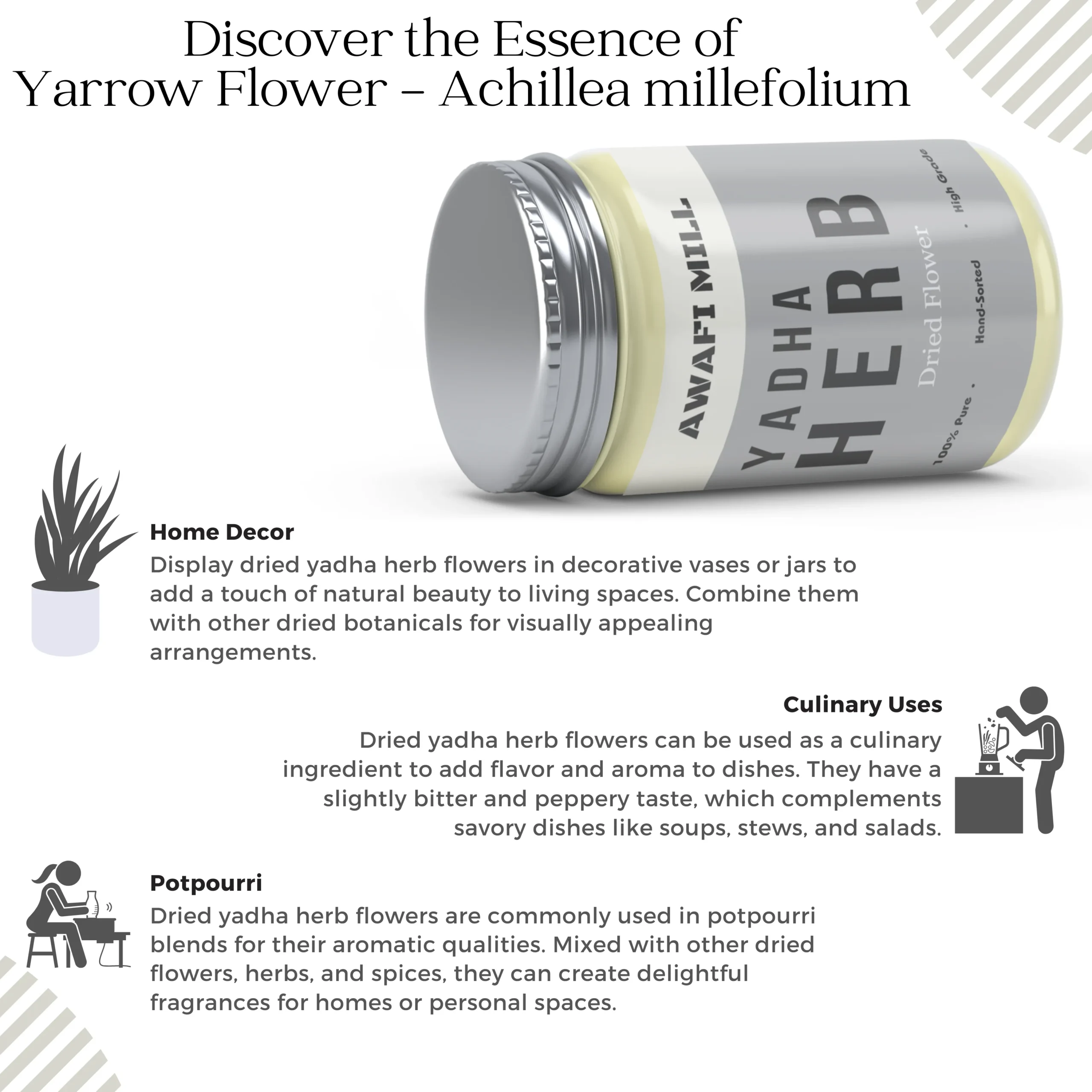 Awafi Mill Yadha Herb, also known as Yarrow or Achillea millefolium, is a time-honored botanical valued in traditional practices. Carefully dried to preserve its natural color and properties, it is commonly used in herbal infusions, cultural remedies, and wellness blends. A trusted herb with centuries of heritage.