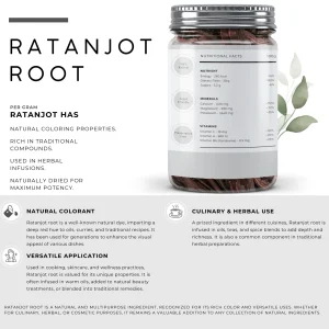 27,50 د.إ – 101,25 د.إPrice range: 27,50 د.إ through 101,25 د.إWhole roots of Alkanna tinctoria (Ratanjot) Deep reddish hue with earthy aroma Used in traditional herbal blends, natural dyes, and wellness preparations -